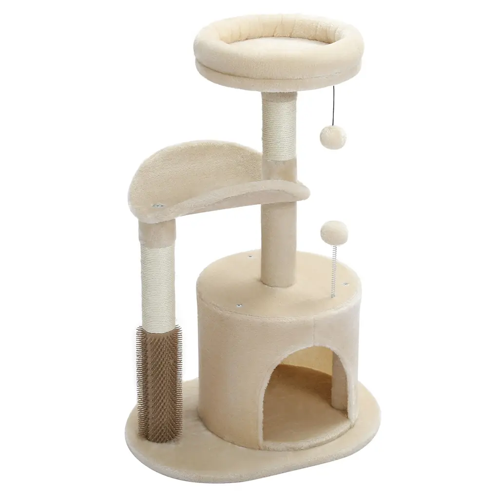 Specifications:Key Features:● Multifunctional Cat Activity Center: The 3-tier multifunctional cat tower is designed with a cozy top perch and a private cat condo, offering a luxurious napping experience. And there exists a rotatable jumping platform for lounging. Moreover, it comes with 2 amusing dangling balls for adding more fun.● Sturdy Metal Frame: In contrast to normal wooden cat trees, our cat tower is supported by sturdy metal supporting posts, offering excellent stability and durability. And the metal posts are fully-covered, ensuring safety. In addition, it is fully covered by fabric, ensuring safety.● Durable Scratching Posts: The cat climbing stand is equipped with durable scratching posts, which can protect your furniture while helping cats to sharpen their claws. Moreover, it is covered by paper strings, which are wear-resistant, durable, and safe to use.● Unique Top Perch: The top perch features a breathable hand-woven paper string basket, creating a comfy resting spot. Moreover, there exists an ultra-soft and pet-friend plush cushion, bringing warmth and ultimate comfort to your lovely cats. And the cushion can be removed for easy cleaning.● Stylish and Elegant Appearance: The decorative cat tree features an exquisite flower shape perch, curved trunk shape frame, flower shape dangling balls, and a pentagonal platform, which attracts cats' attention while adding a lovely atmosphere to your home.
