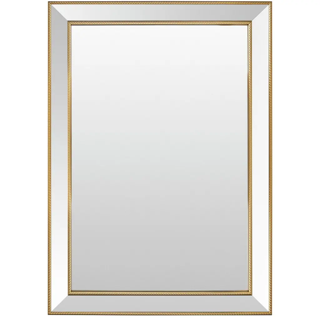 Elegant beveled mirror is framed in a traditional step profile wood with distressed silver leaf and beaded lip with black painted edging.