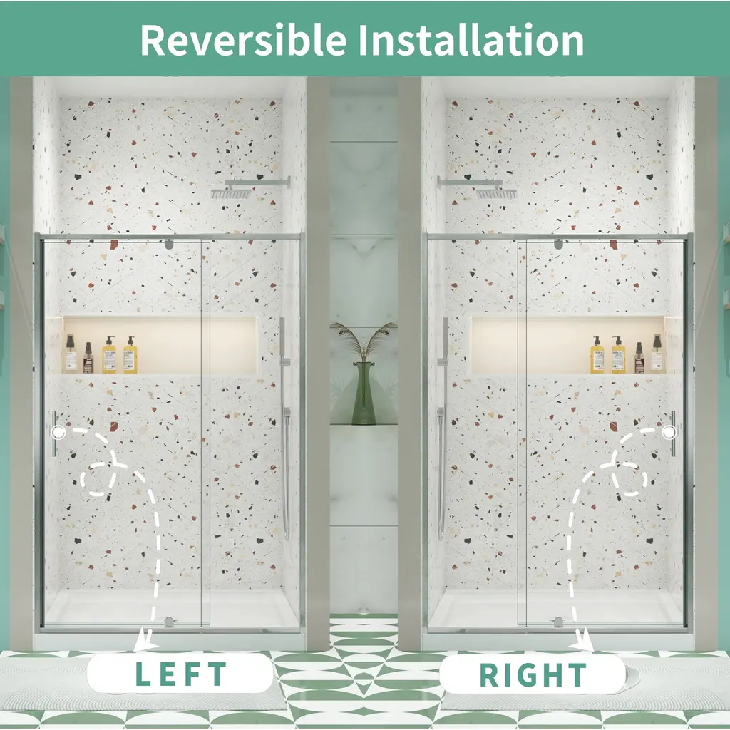 [Shower Door] The stylish shower door makes your bathroom modernized. Enjoy your showers by creating a comfy privacy space. Keep your bathroom always tidy and clean.[Unique Design] Our handles feature a unique design that adds a fresh new look to your shower door. You can easily open and close the door with the handle.[Clear Finish] Modern clear glass creates a beautiful finish that lets in light but also offers some privacy. It is the best choice for your bathroom.[Scratch & Tarnish Resistant] The hardware is finished in chrome, build to resist daily scratches & tarnish. The chrome surface for a modern appearance complements most decorating styles.[Modern Elements] This shower door with a classic finish design adds more modern elements to your bathroom, creates a modest look and sleek appearance.It can stand the test of time because it will never go out of date.[Easy to install] This shower door accommodates left or right-side installation.