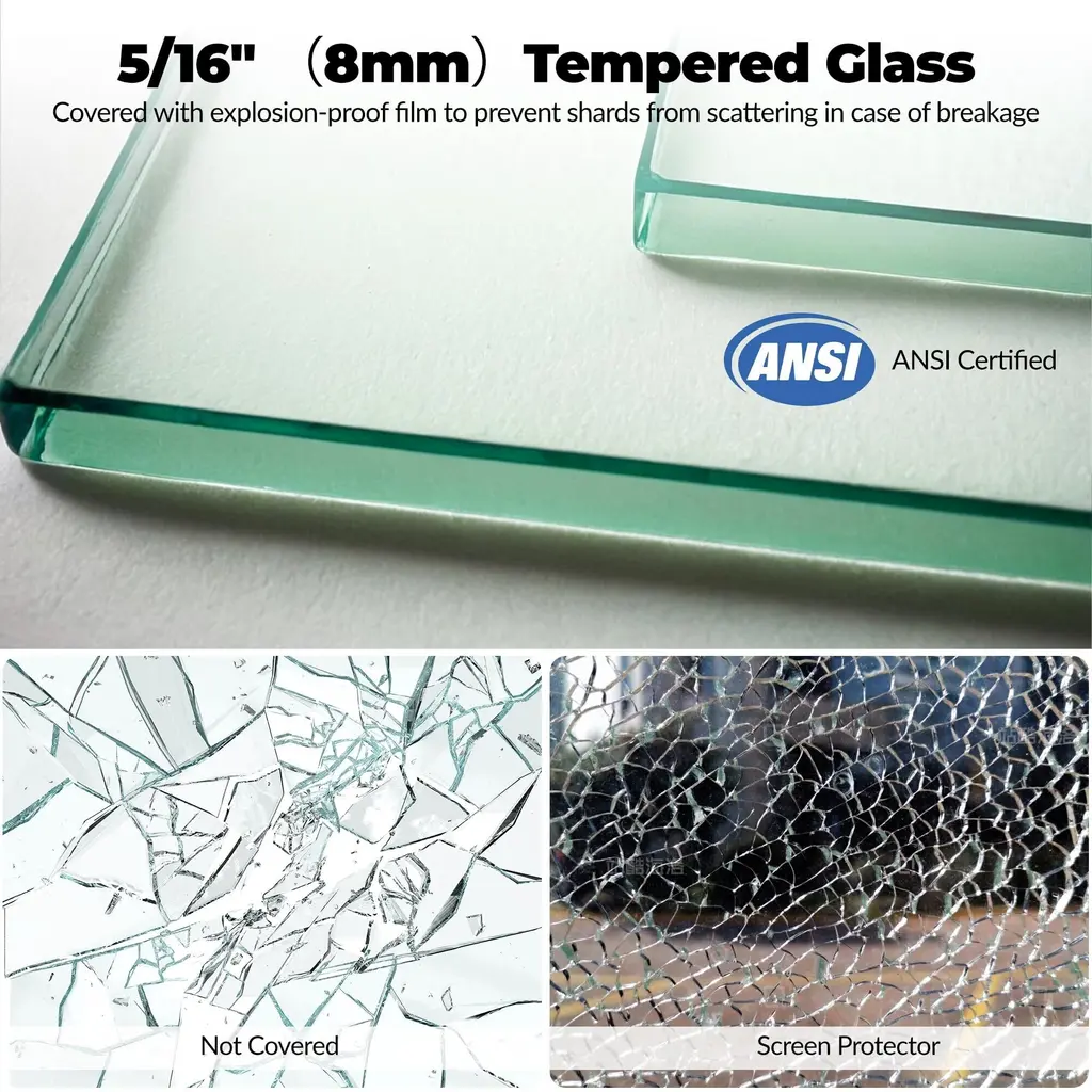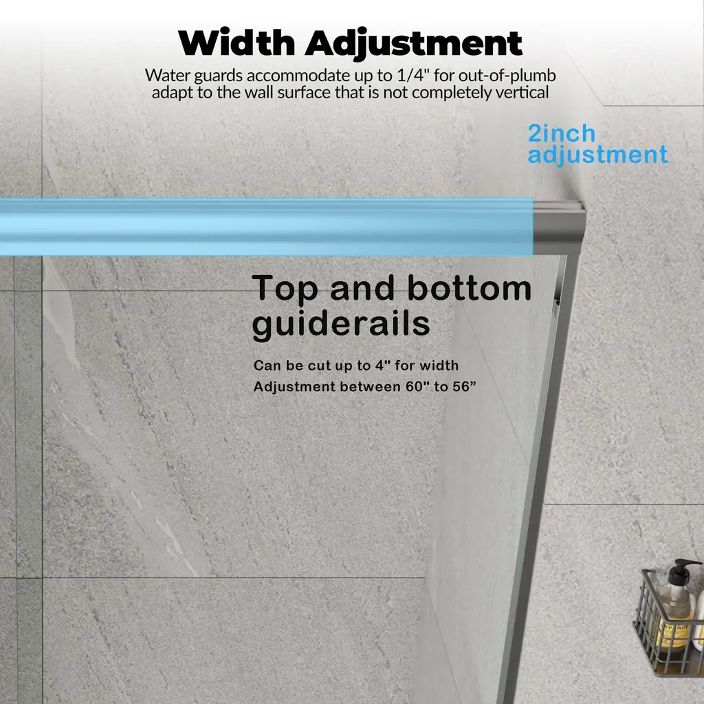 Adjustable Installation Width:The tracks of this shower glass door can be easily trimmed for a precise fit, offering a versatile installation width. With up to 2 inches of adjustability on each side, it accommodates an overall width of 44 to 48 or 56 to 60 inches and a walk-in width ranging from 24.4 to 28.4 inches. Premium Tempered Glass: Crafted from ANSI-certified 5/16" (8 mm) tempered glass, this semi-frameless shower door features an explosion-proof film, enhancing safety and ensuring long-lasting performance Double Stainless Steel Handles:This shower door is equipped with double smooth handles for effortless sliding from either side. Additionally, the integrated towel bars provide a convenient solution for hanging towels and clothes, enhancing both functionality and ease of use. Easy to Clean:The glass shower door includes a waterproof nanocoating that repels water spots and soap scum, making cleaning and maintenance a breeze. The thoughtfully designed bottom and side seals effectively prevent leaks and splashes, ensuring a dry and tidy bathroom floor. Reversible Installation:Offering flexible installation options, this sliding shower door can be mounted on either the left or right side, allowing you to customize it according to your preferences and the layout of your bathroom.Upgrade your shower experience with this stylish and functional sliding glass door, perfectly designed to enhance your bathroom space while providing convenience and security.