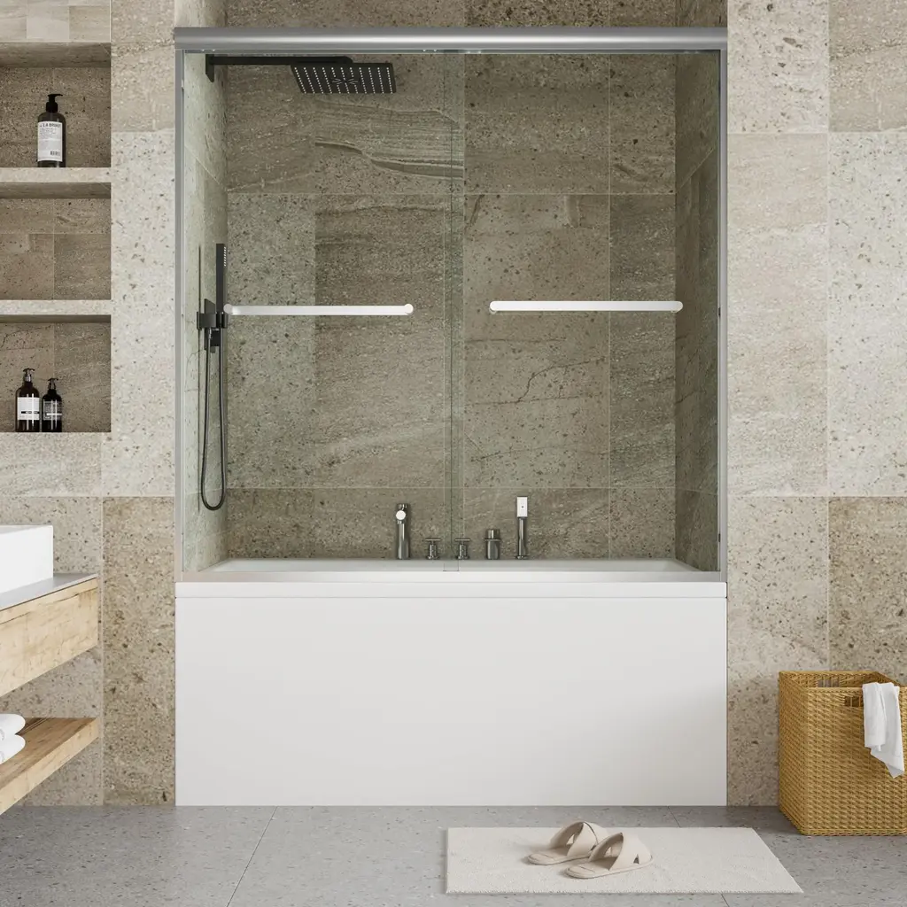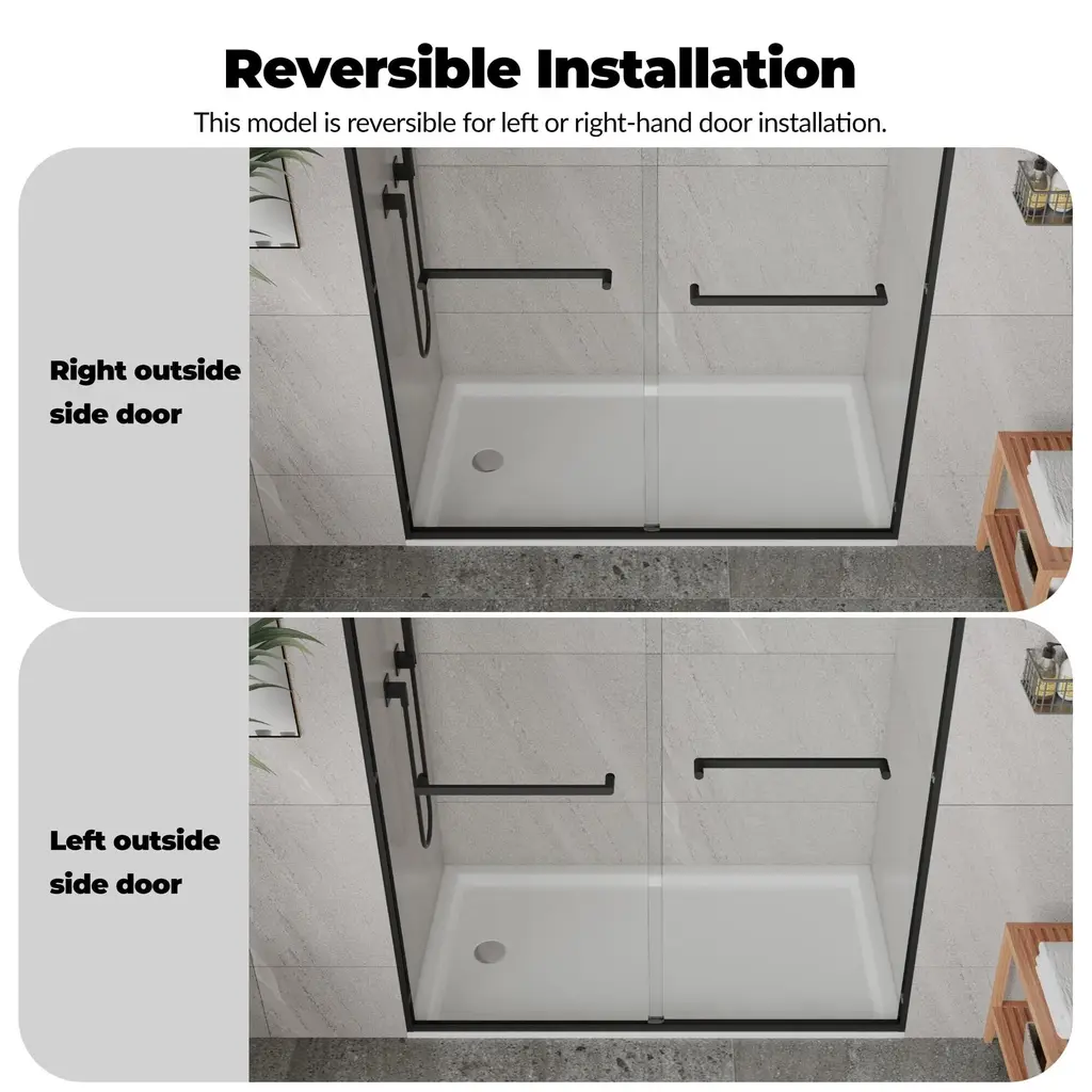 Adjustable Installation Width:The tracks of this shower glass door can be easily trimmed for a precise fit, offering a versatile installation width. With up to 2 inches of adjustability on each side, it accommodates an overall width of 44 to 48 or 56 to 60 inches and a walk-in width ranging from 24.4 to 28.4 inches. Premium Tempered Glass: Crafted from ANSI-certified 5/16" (8 mm) tempered glass, this semi-frameless shower door features an explosion-proof film, enhancing safety and ensuring long-lasting performance Double Stainless Steel Handles:This shower door is equipped with double smooth handles for effortless sliding from either side. Additionally, the integrated towel bars provide a convenient solution for hanging towels and clothes, enhancing both functionality and ease of use. Easy to Clean:The glass shower door includes a waterproof nanocoating that repels water spots and soap scum, making cleaning and maintenance a breeze. The thoughtfully designed bottom and side seals effectively prevent leaks and splashes, ensuring a dry and tidy bathroom floor. Reversible Installation:Offering flexible installation options, this sliding shower door can be mounted on either the left or right side, allowing you to customize it according to your preferences and the layout of your bathroom.Upgrade your shower experience with this stylish and functional sliding glass door, perfectly designed to enhance your bathroom space while providing convenience and security.