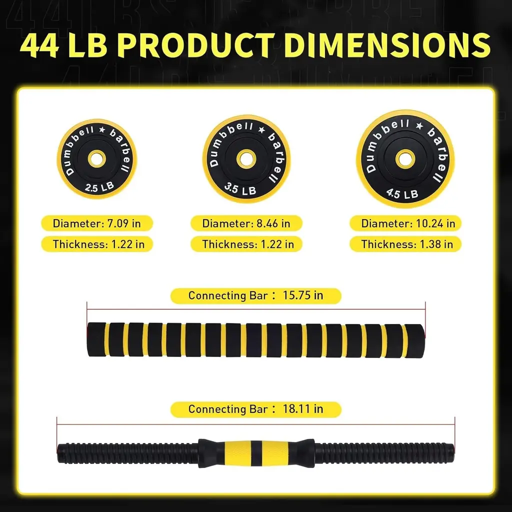Versatile Adjustable Dumbbell Set: The adjustable dumbbell weights can be used as dumbbells and barbells. The dumbbells can be 5-44 lbs, and the barbell weights can be 11-44 lbs.44 LB Package Included: 4 x 4.5 lb dumbbell weight plates, 4 x 3.5 lb dumbbell weight plates, 4 x 2.5 lb dumbbell weight plates,2 x dumbbell bars, 1 x connecting rod, 8 x nuts.Double Locking to Ensure Your Safety: There are 2 types of fixing nuts to ensure your safety. Just assemble the dumbbell plates with 2 nuts and you can get different weights to start exercising.Comfortable Foam Bar Connector: The connector is made of soft foam, which can protect your shoulders well when you use it as a barbell. The dumbbells are coated with high-quality PE, which is harmless to your body. The dumbbell weights are filled with different proportions of iron sand, which is sturdy .Great for Home Gym: The dumbbell weights can be used as 2 types of dumbbells and 2 types of barbell weights to meet your different needs for exercising in your home gym. It is also easy to store and saves space.