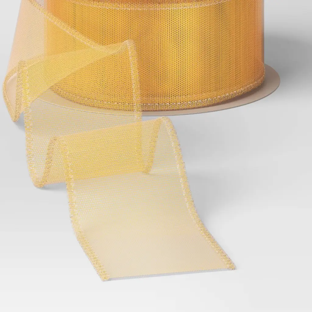 Add a bright style to your festive gift-giving with this Christmas Sheer Fabric Ribbon from Wondershop. Packaged on a spool for convenient use, this 45-foot-long decorative ribbon features a sheer construction in gold hue with wired edges for a stunning look. Plus, the sheer fabric ribbon can be styled into a beautiful bow or a flower to effortlessly finish your gifts or accent holiday decor.Welcome to the Wondershop™.