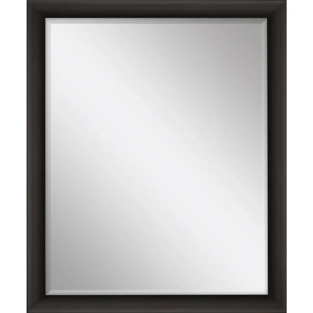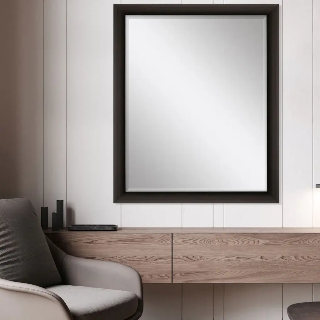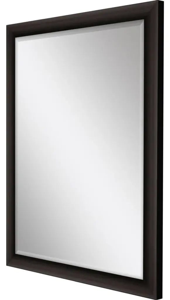 Elegant beveled mirror is framed in a block profile moulding in a dark wood finish with silver lip.