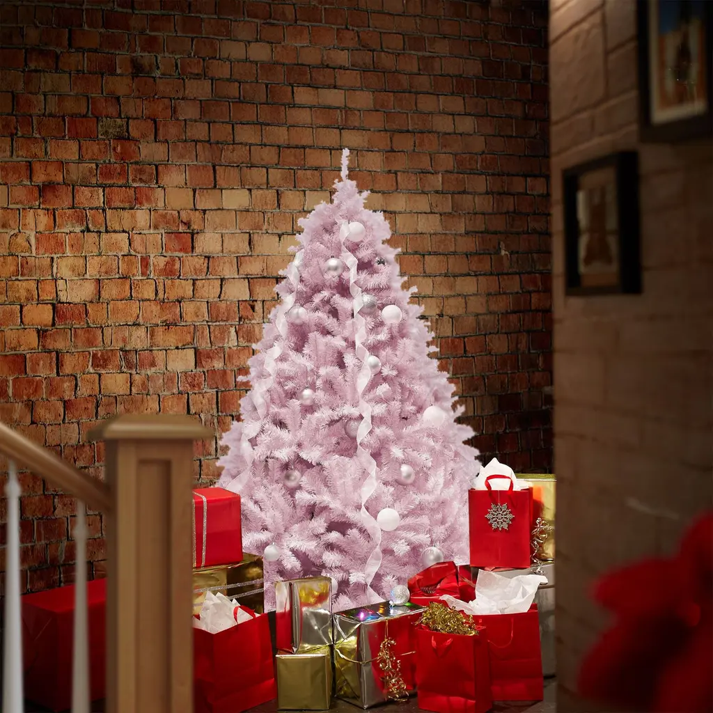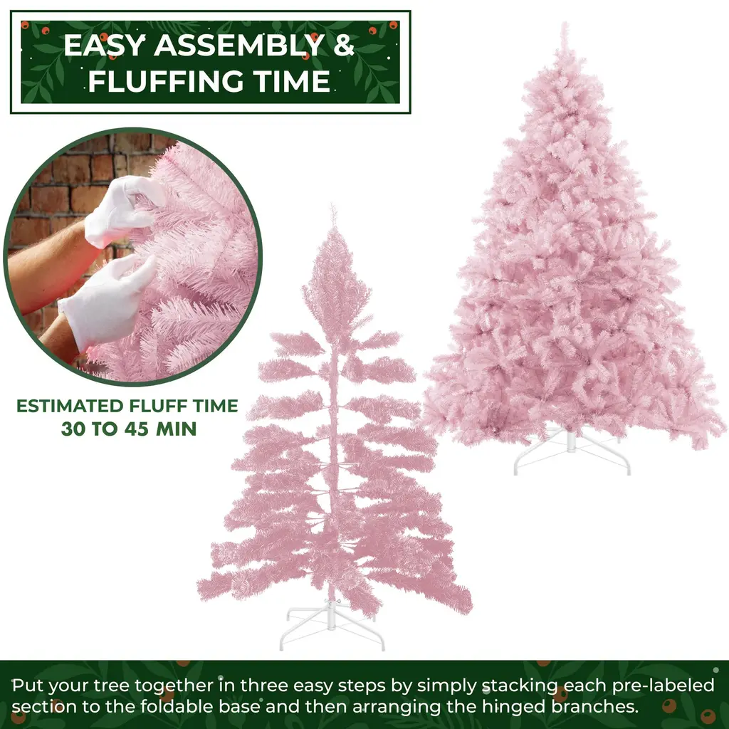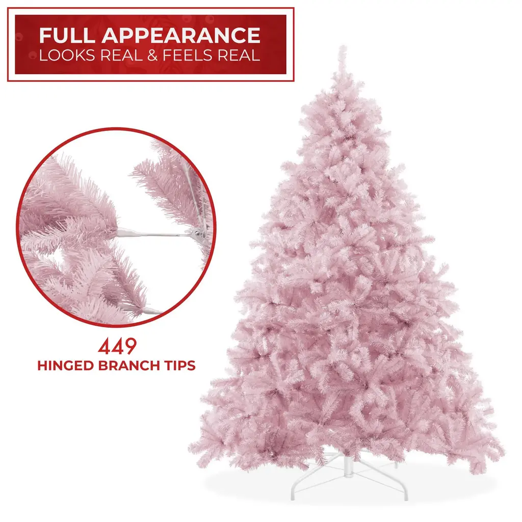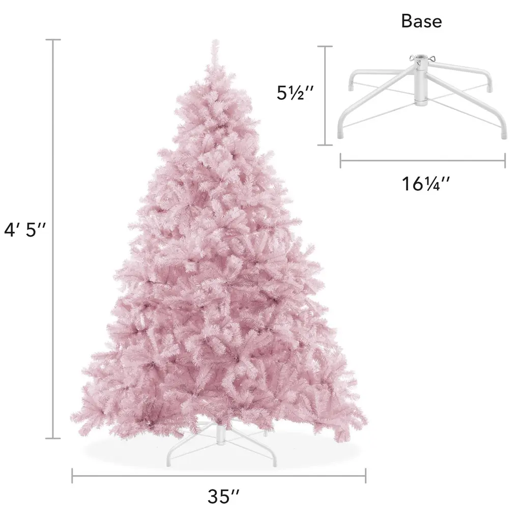 Extremely realistic: This true-to-life 4.5-foot tree contains over 400 individual branches and needles. This craftsmanship and detailed design make this the most realistic artificial Christmas tree in its class. Inspire holiday cheer this season with this unique pale pink color is perfect for Valentine's Day, Christmas, and other festive events. Its full lush shape is a perfect backdrop for your holiday decorations.Premium quality: Designed and constructed using the newest manufacturing technology and highest-quality materials, our holiday trees create the illusion of genuine, fresh-cut, spruce trees. Faux (fake) Christmas trees are the best value, as they are affordable and will last for holiday seasons to comeBuilt to last: Constructed with premium grade materials, the branches and needles are both flame retardant and non-allergenic. Features hundreds of individually crafted, pre-attached, hinged branch tips with durable metal hingesIncludes Sturdy Metal Stand: This tall Christmas tree stands straight on its foldable metal base. Integrated rubber feet help keep the tree in place and your floors scratch-free.Easy assembly and takedown: Put your tree together in three easy steps by simply stacking each pre-labeled section to the foldable base and then arranging the hinged branches. For its most lush and full form, please set aside 30-45 minutes to properly shape the tree. Simply pull down and arrange the branches to your preference, with the included protective gloves. If you are looking for a touch of luxury this Christmas, this is the tree you’ve been looking for! Its unique pale pink color will make your holiday decorations pop and sparkle for Valentine’s Day, Christmas, and other festive events. This true-to-life trees' craftsmanship and detailed design make this the most realistic artificial Christmas tree in its class. Built using the newest manufacturing technology and highest-quality materials, our holiday trees create the illusion of genuine, fresh-cut, spruce trees. Faux (fake) Christmas trees are the best value, as they are affordable and will last for holidays to come. The branches and needles are both flame retardant and non-allergenic. This tall Christmas tree stands straight on its foldable metal base. Integrated rubber feet help keep the tree in place and your floors scratch-free. Set up in 3 easy steps; place the base, stack each pre-labeled section, and arrange the branches using the included protective gloves. Specifications: Tree Dimensions: 4.5' High x 35" Diameter Hinged Branches: 449 Stand: 5.5" High x 16" Diameter