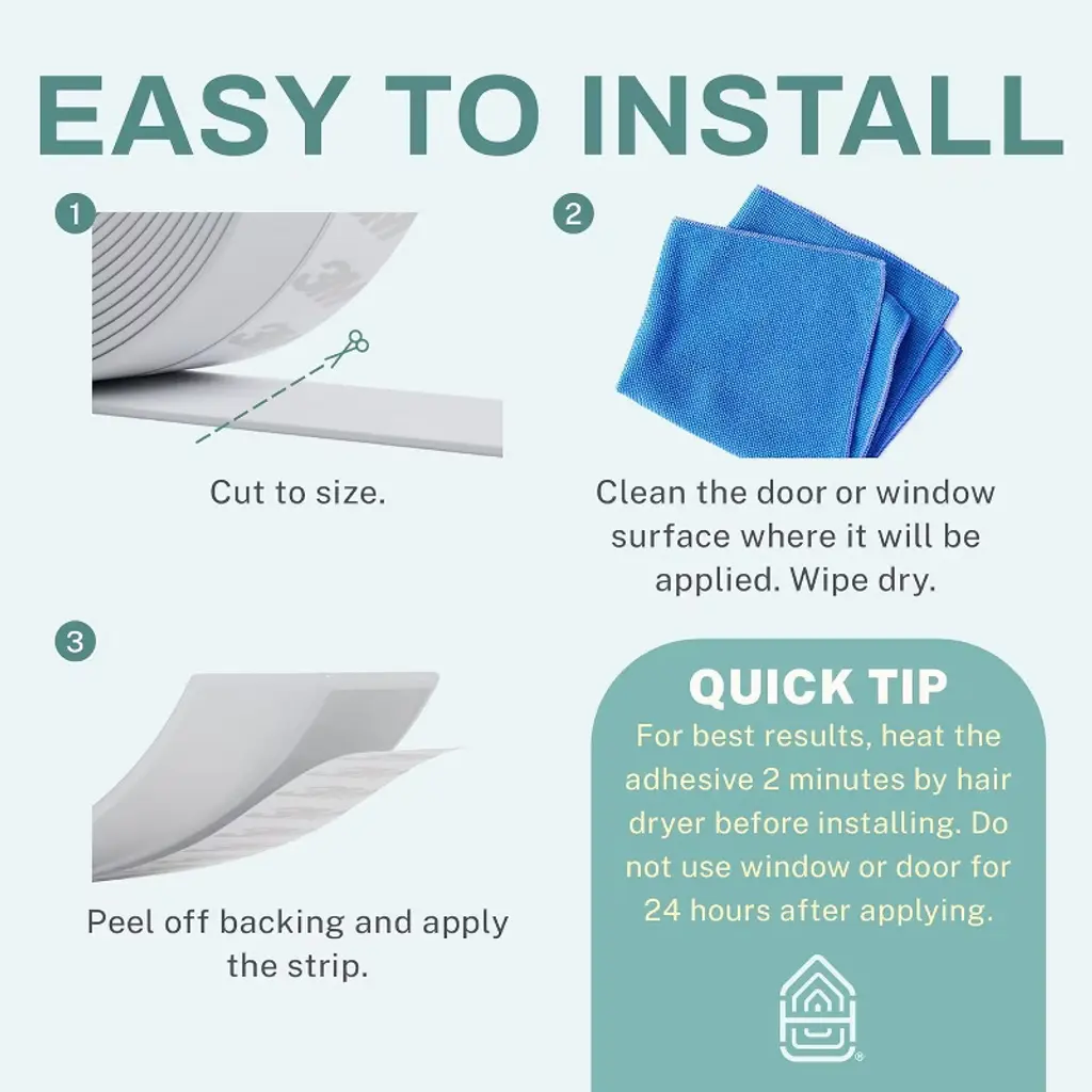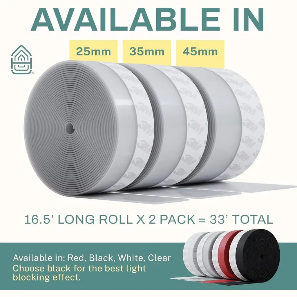 Use silicone weatherstripping for high-quality windows and doors that need to perform in all weather conditions. Cover up gaps between the door or window and its frame to keep the inside of your home or business more comfortable. Save on energy, electricity, and heating/cooling costs.PRODUCT FEATURES:2 Pack of 16.5 Ft. Roll (33 Ft. Total)For Doors and WindowsMade of Silicone RubberResilient and FlexibleNon-ScratchingEasy to InstallWide Surface ApplicationAVAILABLE IN:4 Colors: Red, Black, White, Clear3 Sizes: 25mm, 35mm, 45mmEASY INSTALLATION1. Cut to size.2. Clean the door or window surface where it will be applied. Wipe dry.3. Peel off backing and apply the strip.* For best results, heat the adhesive 2 minutes by hair dryer before installing. Do not use window or door for 24 hours after applying.PREVENT ENVIRONMENTAL INTRUSIONSIsn’t great when you can truly block out the world and finally enjoy some peace and quiet? Use our versatile weatherstripping adhesive to stop cold, heat, dust, drafts, noises, odors, and water from entering or exiting. Effectively adheres to a variety of surfaces including wood, glass, plastic, and aluminum without damaging. The mechanical properties of silicone rubber allow it to perform consistently at high and low temperatures with superior insulating ability.VERSATILE DOOR & WINDOW APPLICATIONSuitable for a wide variety of household and commercial sealing applications on exterior doors and windows, as well as interior structures and frames. Use it effectively for threshold weatherstripping, window draft seal, door draft seal, refrigerator door sealer, shower door seal, acoustic door sealant, French door seal, sliding glass door weatherstripping, patio doors insulation, window winter seal, and double hung window seal.