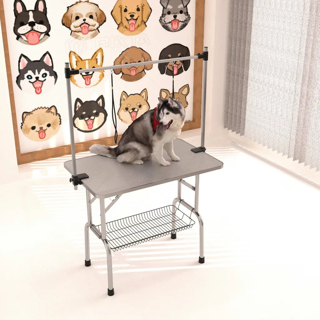 【Safe & Stable】Made from high-quality materials and featuring a sturdy construction, our pet grooming table ensures your pet's safety and comfort during the grooming process. The anti-slip surface and rubber feet enhance stability, allowing your pet to stand confidently.【Convenient Storage】Our grooming table comes with a storage basket, allowing you to easily store grooming tools, combs, and scissors. Keep your pet grooming area neat and tidy, improving your work efficiency.【Integrated Arm & Leash】The adjustable grooming arm and leash help you secure your pet effortlessly, preventing them from moving around during the grooming process. Enjoy a pleasant grooming experience.【Foldable & Portable】Our pet grooming table features a foldable design, making it easy to store when not in use, saving space. It's suitable for both home and professional salon use, meeting your diverse needs.【Versatile Usage】Perfect for grooming dogs and cats of various sizes, our pet grooming table makes trimming, brushing, and nail clipping a breeze. Enhance your pet's appearance and maintain their hygiene with ease.