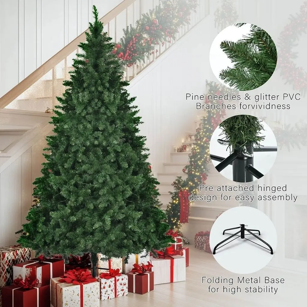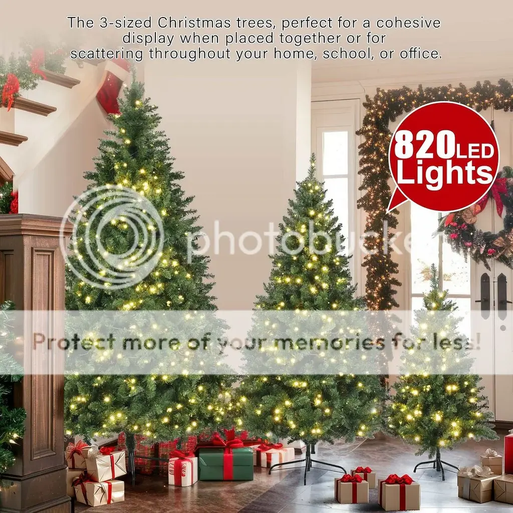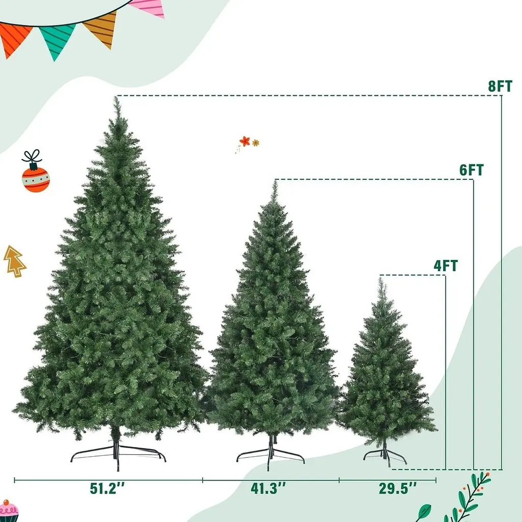 Transform your home into a festive holiday haven with this set of three pre-lit green pine Christmas trees, featuring 820 warm-yellow LED lights. With a realistic design, these 4ft, 6ft, and 8ft trees offer lifelike branch tips and dense foliage to bring the charm of a wintry forest to any space. Easy to assemble with hinged branches, they create a cozy atmosphere without the hassle. Perfect for home, office, or party settings, these durable PVC trees will bring joy for years to come.FeaturesSpecifications