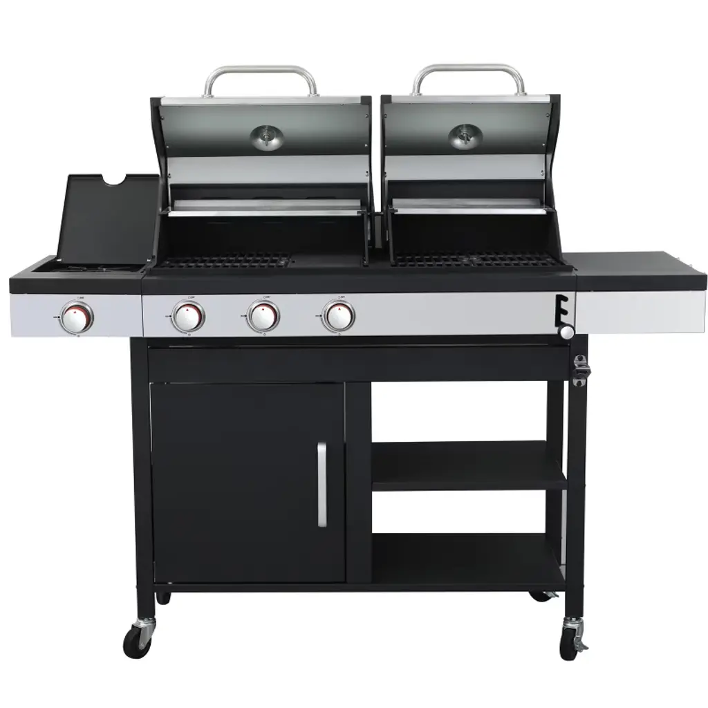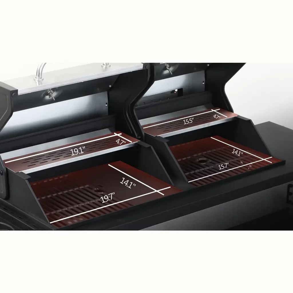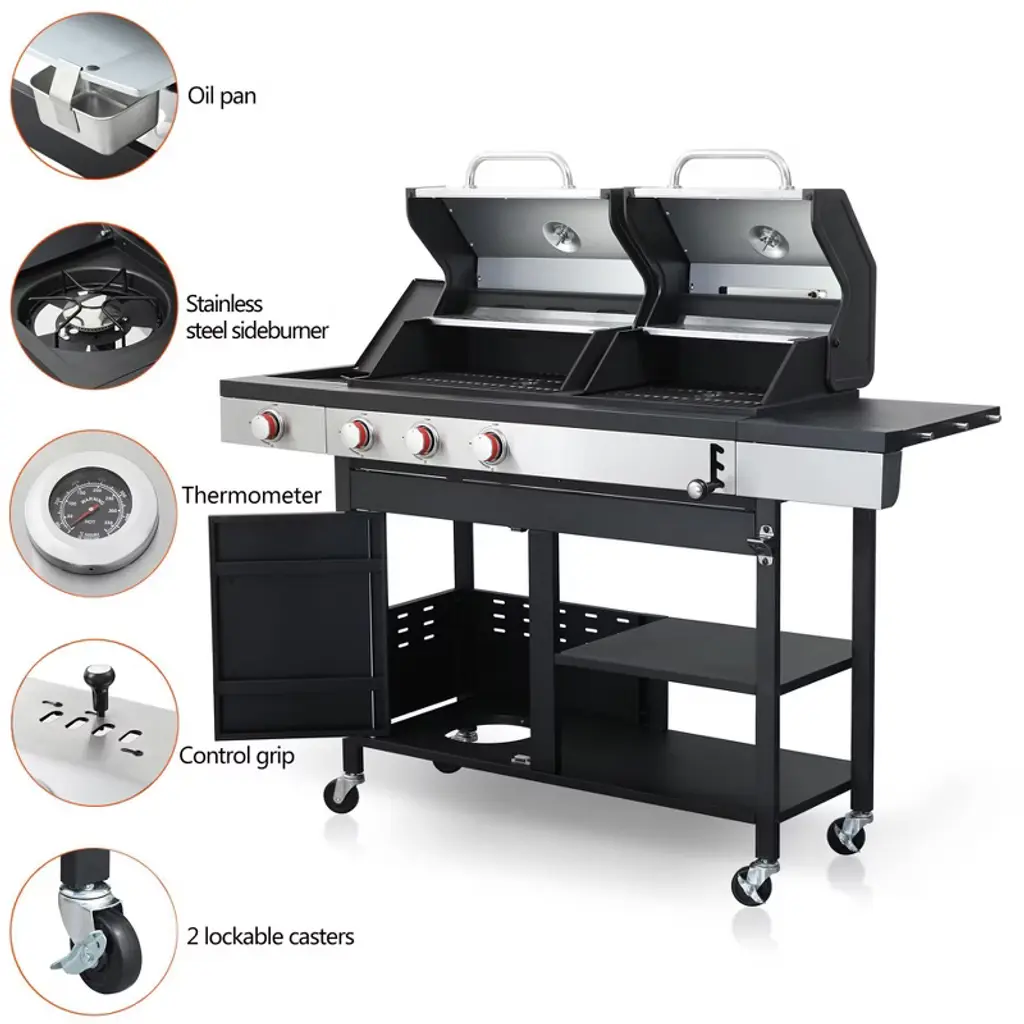Description: 【Firebox】: Steel, with high-temp resistant(550C) powder coating 【caster】: 2pcs 3inch lockable casters, 2pcs 3inch casters without lock 【Enamel cast iron cooking grids】: Charcoal side:2pcs 7.9x14.4inch; Gas side: 1pc 7.9x14.4inch + 1pc 11.8x14.4inch 【Warming rack】: #430 Stainless steel warming rack 【Ignition system】: Push and turn, integrated automatic easy ignition 【Thermometer】: Stainless steel(100-800F) 【Flame tamper】: Enamel flame tamper, 3pcs 【Bottle opener and hooks】: #430 SS bottle opener, 1pc, with 2pcs hooks 【Power】: 9560BTU * 3 + 8550 BTU*1=37230 BTU
