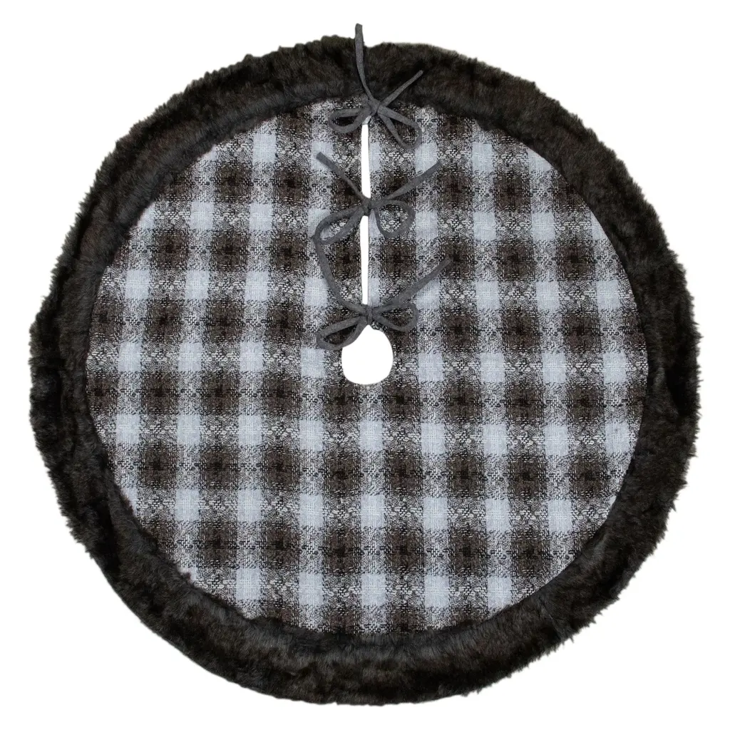 Add a rustic and cozy touch to your holiday decor with this plaid tree skirt. The brown and black design with brown faux-fur trim will make your tree standout. A perfect addition to your home this Christmas! Product Features: Brown white and black plaid Christmas tree skirt. Brown faux fur border. One-sided design. Solid gray on the back of the stocking. Tie closures in the back for placement. Spot clean or dry clean only. Recommended for indoor use only. Perfect to protect floors and carpets surrounding your tree. Note: Matching Christmas stocking sold separately. Dimensions: 48" diameter. Material(s): fabric/faux fur