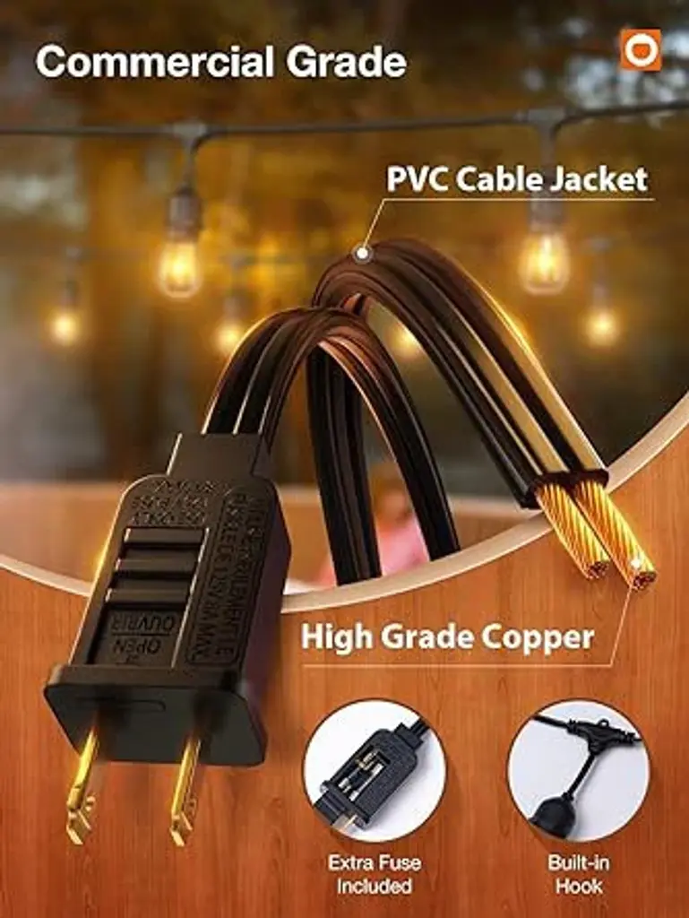 Color BlackBrand addlonIndoor/Outdoor Usage Outdoor, IndoorSpecial Feature dimmable( dimmer not included)Light Source Type IncandescentPower Source Corded ElectricLight Color YellowTheme VintageOccasion Birthday, Wedding, Christmas, PartyStyle VintageIncluding 18 Edison Bulbs: Each strand contains 15 hanging sockets, provided with 18pcs S14 incandescent glass bulbs . The distance between bulbs is approximately 3.11FT. This Heavy-duty light is bright enough and ideal illumination anywhere.Weatherproof & Heavy-duty: This outdoor string lights are UL listed weatherproof commercial. The insulation material can protect the strand from hot winter, sun, wind, rain, snow and damp. Flexible heavy-duty cord withstands the wear of indoor and outdoor use.Dimmer Compatible to Set The Right Mood: For greater mood lighting flexibility and a soft glow, a dimmer switch�not included】 to create the perfect atmosphere for a birthday party, family reunion, or wedding reception. It adds flair to bistro deck porch patio garden backyard terrace pergola café restaurant malls for wedding BBQ party banquets, also suitable for tree-lighting like Christmas tree.Smart Installation: Each socket has hanging hook above, makes it easy for hanging with hooks, guide wires, or zip ties. It can connect with another simply use grounded cord plugs into any standard outlets. Link up to 5 strands.Satisfaction Guaranteed: Your satisfaction is first. If you are not fully satisfied for any reason, please contact us.11.85 x 9.76 x 6.06 inches; 4.12 Pounds
