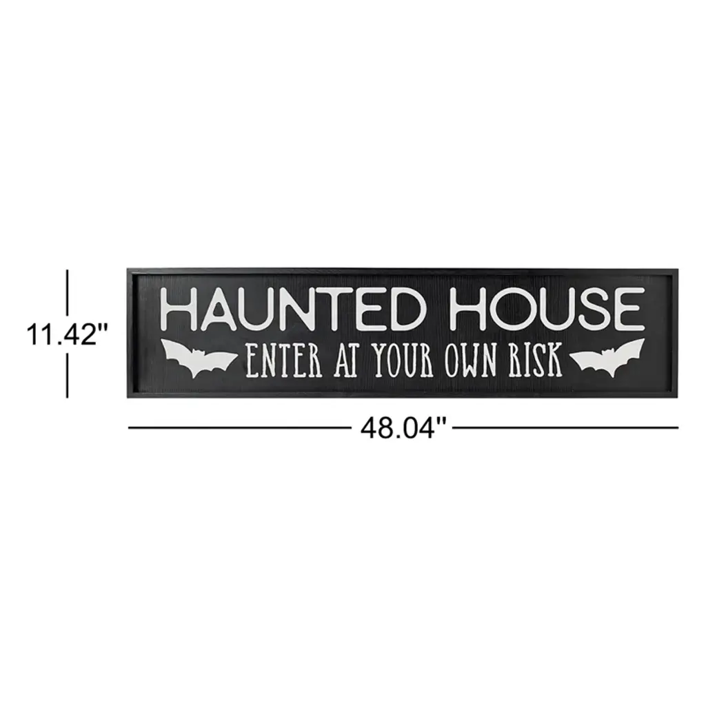 This 48.04 in L Halloween sign makes a great addition to any home this year! This sign is made of Wood, and features the message 'Haunted House Enter at your own Risk'. This sign features two bat designs in white on a black background to add a spooky feeling to this Wall Sign