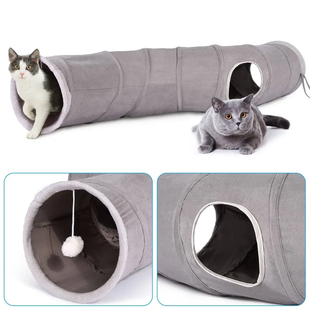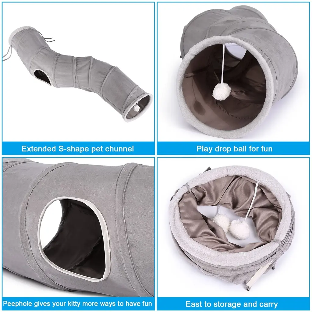 Keep Your Pets More ActiveThe cat tunnel is a favorite of many of our cats. They will like to explore and go through tunnels for fun.Cat play tunnel is the perfect toy to keep your pet active even while you're not at home.WHY Choose Our Tunnel Toy for Cats?*High QualityIt is made of canvas, rather than most of the vinyl type on the market, Our fabric is sturdy,more safe,and this fabric does not make the crinkle sound.*Come with Cat Feather WandThey are three-way tunnels, drop ball toys as well as peep holes, stimulating a cat's curiosity to look what inside the channel.Included feather wand brings the cats hours of fun.*Unique Design:Extra Long,-Shape48"in length, 7.8" in diameter, great for kittens, adult cats,even for puppies, and makes a great pet tunnel for multiple cats.Description: Ownpets large cat tunnels can make your cat to have more ways to have fun, we also provide drop balls and peep holes for your cat to have extra recreational activities.Features:Package:1 * S-shape Cat Tunnel1 * Cat Teaser