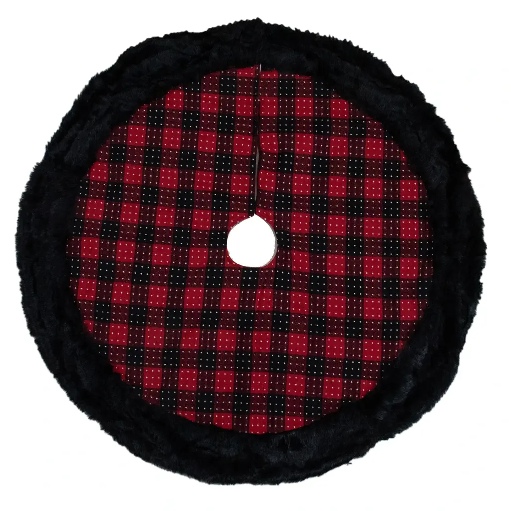 Add a pop of color to your holiday decor with this plaid stocking. The red and black design with black a faux-fur trim will make your tree standout. A perfect addition to your home this Christmas! Product Features: Red and black plaid Christmas tree skirt. White polka dot design on each square. Button closure in the back for placement. Features a black faux fur border. One-sided design. Solid red on the back of the stocking. Spot clean or dry clean only. Recommended for indoor use only. Perfect to protect floors and carpets surrounding your tree. Note: Matching Christmas stocking sold separately. Dimensions: 48" in diameter. Materials: polyester/faux fur