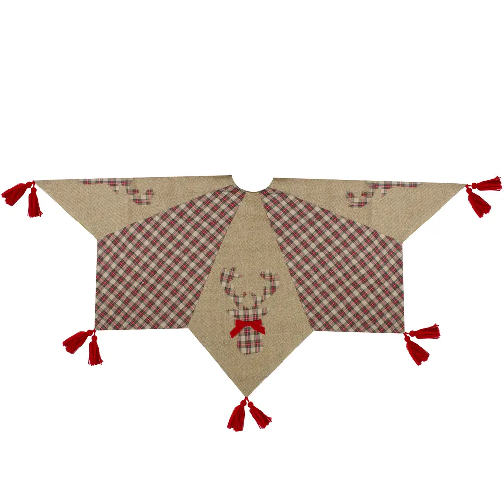 48" Red And Brown Burlap And Plaid Reindeer Christmas Tree Skirt With Tassels - 48 - Brown