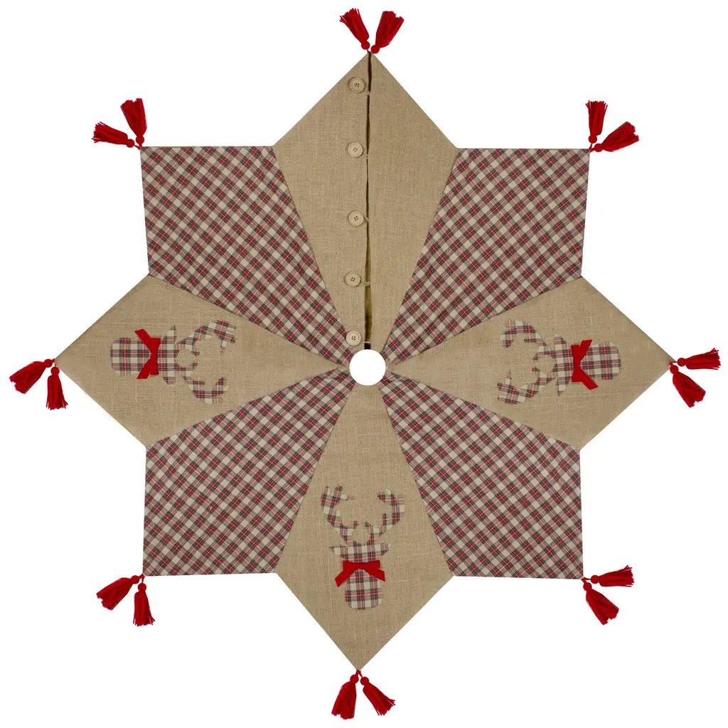 Celebrate a classic lodge Christmas with family and friends this year. Add some rustic charm to your holiday decor with this lovely tree skirt. The tree skirt is burlap and red plaid reindeer design with red tassels around the diameter. This a perfect skirt for your gifts on Christmas morning! Product Features: Red plaid and burlap Christmas tree skirt Reindeer appliques designs Red tassels around outside of skirt 5 button closure Skirt has a star shaped edge design Recommended for indoor use only Care instructions: spot clean Dimensions: 48" diameter Material(s): polyester/burlap/yarn/wood
