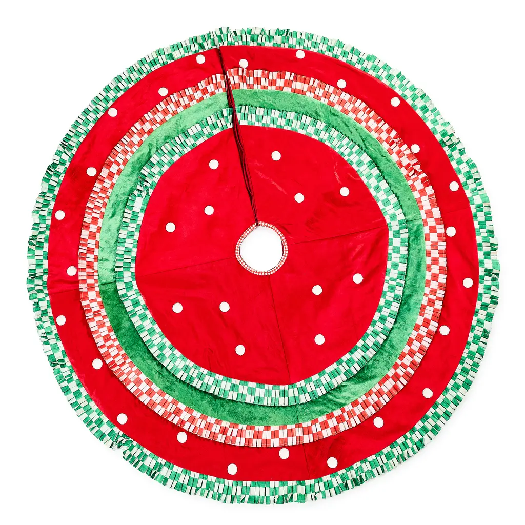 Bring your Christmas tree into focus with this red and green tree skirt. This piece adds a cheerful statement to your holiday tree, enhancing its overall appeal. Don't miss out on such a fascinating article that you will cherish for years to come. Product Features: Red and green traditional round Christmas tree skirt Comes with a white round piping Perfect addition to any holiday decor Dimensions: 48" diameter Material(s): polyester