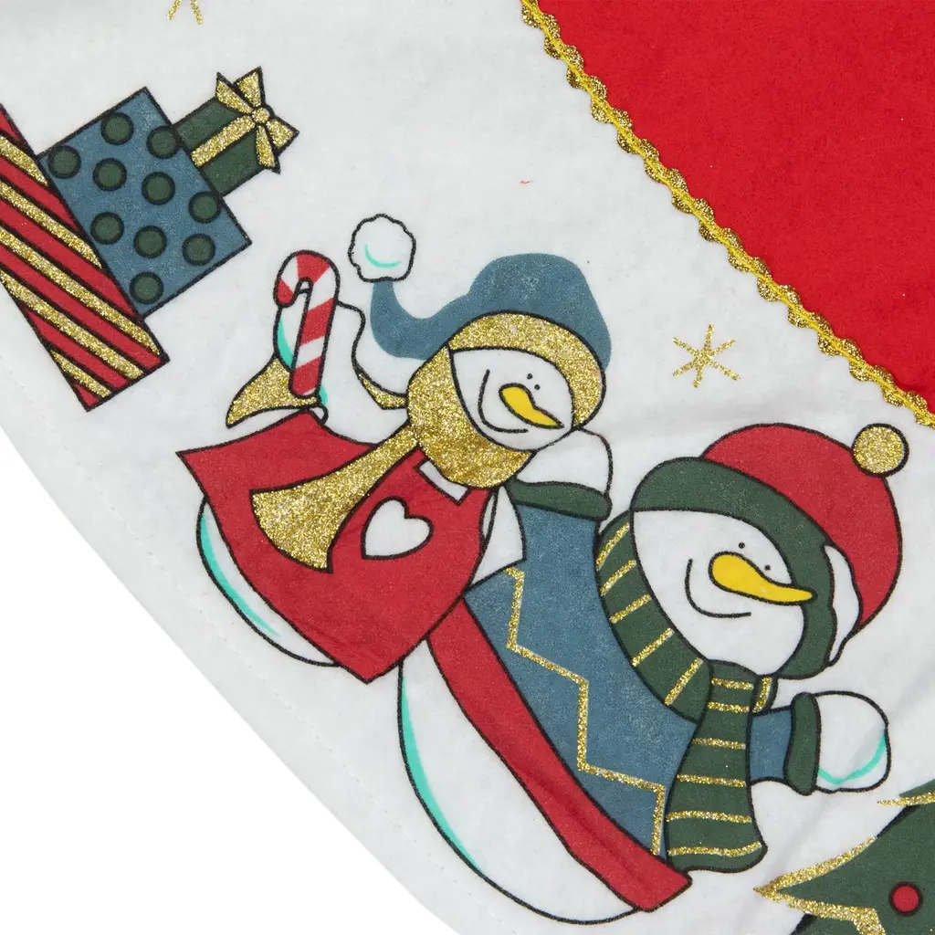 Add a touch of festive charm to your Christmas tree with this adorable tree skirt. This tree skirt features a vibrant red white and gold color scheme adorned with sparkling glitter that adds a touch of magic to your holiday decor. The jolly snowmen scene border brings a playful and heartwarming element to your tree creating a joyful atmosphere for the whole family to enjoy. Accent your tree in this beautiful tree skirt and let the holiday spirit shine brightly throughout your home. Product Features: Snowman Christmas tree skirt Designed with a bright red backdrop Accented with white border featuring a fun snowman scene One-sided design For indoor use only Care instructions: spot clean only Dimensions: 48" diameter Materials: polyester/felt