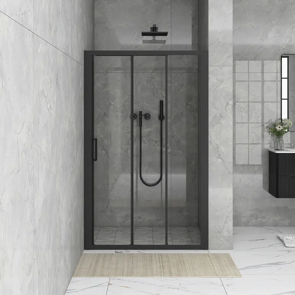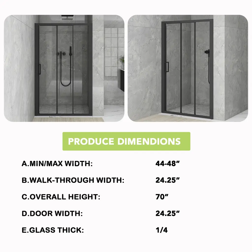 The shower door we offer presents several remarkable selling points. Firstly, the framed shower door features an extremely concise design, adding a touch of elegance and simplicity to your bathroom. Secondly, it comes with adjustable width, making it suitable for different bathroom specifications. No matter what size your bathroom is, this shower door can be customized to fit perfectly. Thirdly, it is reversible for installation, providing you with more flexibility in arranging your bathroom layout. Fourthly, it is coated with nano easy-clean coating, which not only makes cleaning a breeze but also offers excellent anti-fouling and scratch-resistant properties. You don't have to worry about dirt or scratches ruining the appearance of your shower door. Lastly, it has a unique three-panel sliding design, allowing for smooth and convenient operation while saving space. With these outstanding features, our shower door is truly a great choice for enhancing your bathroom experience.[Quality Materials] This shower door is supported by an aluminum frame for its high strength and corrosion resistance that can ensure that the structure remains strong once mounted and used for more years easily.[Shower door] The stylish shower door makes your bathroom modernized. Enjoy your showers by creating a comfy privacy space. Keep your bathroom always tidy and clean.[Single Sliding] The single sliding shower door is everything you want with your bathroom remodel. It has built-in adjustability to ensure that it is a perfect fit in your shower. You can be easily cleaned and maintained by using a squeegee after each use.[Unique Design] Our handles feature a unique design that adds a fresh new look to your shower door. You can easily open and close the door with the handle.[Black Finish] This black finish creates a contemporary look for the bathroom. The surface is processed for long-time service and is easy to maintain.[Clear Finish] Modern clear glass creates a beautiful finish that lets in light but also offers some privacy. It is the best choice for your bathroom.[Modern Elements] This shower door with a classic finish design adds more modern elements to your bathroom, creates a modest look and sleek appearance.It can stand the test of time because it will never go out of date.