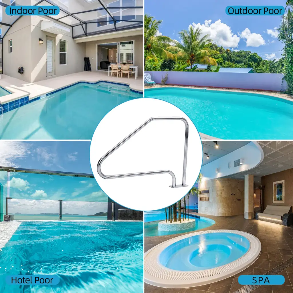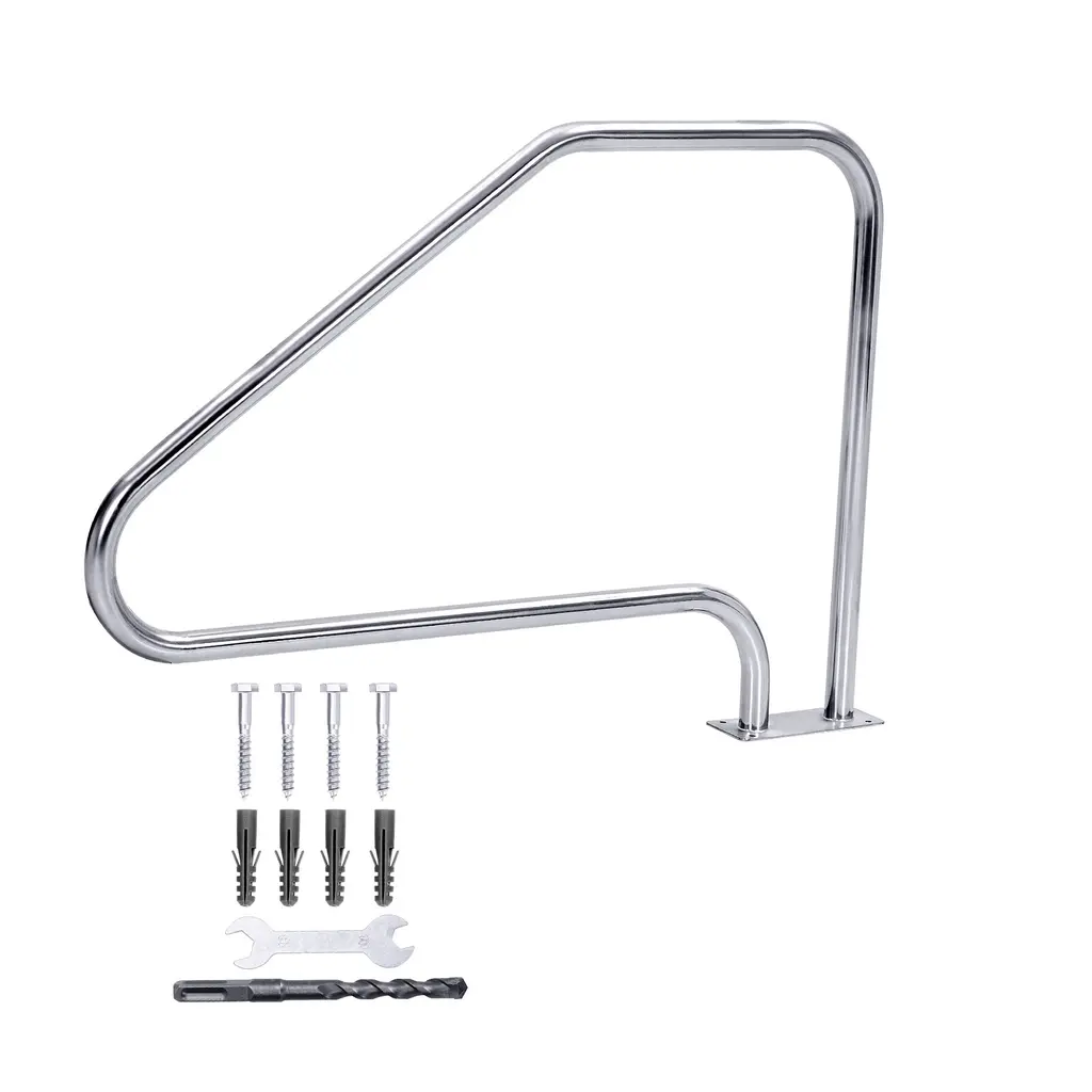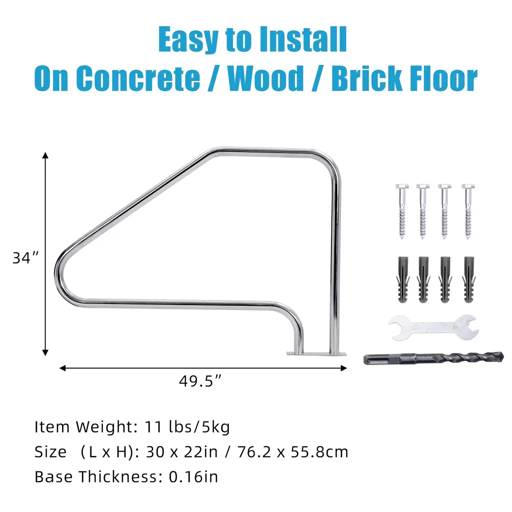 High-Quality Stainless Steel - Made with 304 stainless steel, this swimming pool handrail is rust-resistant, wear-resistant, and won't deform over time, ensuring it maintains its original quality for a long time. It can be used both indoors and outdoors in any region. The standard diameter size of the pool handrail is ergonomically designed for a firm and comfortable grip.Wide and Stable Base - The redesigned base plate provides greater stability, and the firm welding between the handrail and the main body ensures it can withstand up to 380 pounds, making it trustworthy for both children and the elderly.Easy to Install - The pool handrail has a base plate that can be installed on concrete floors, wood floors, or brick floors. It stands firmly. It is effortless to assemble by one person in a few minutes. Firstly, you should measure the distance from the tile on the inside of the pool as needed, then mark and drill the four pre-drilled holes; use the included screws and anchors to tighten.Handle Cover - Equipped with a removable, non-slip nylon handle cover that prevents the metal handrail from getting too hot to touch on hot days. We use heat-shrinkable form to add a protective cover to the handrail. You can also cut it to replace other covers if you need to replace it.Versatile Use - Size: 34" x 49.5", This pool railing is suitable for small residential or hotel pools, as well as hot springs. It effectively helps people leaving the pool from slipping and falling.