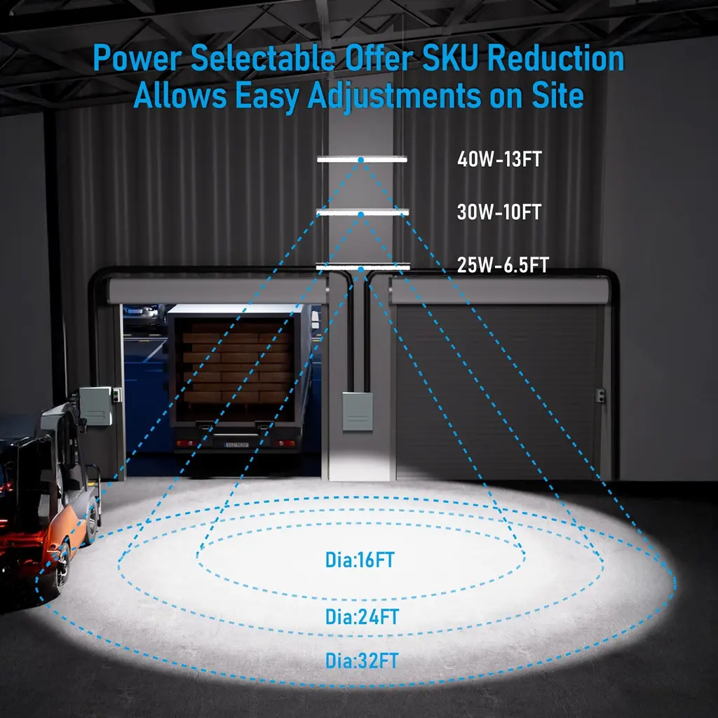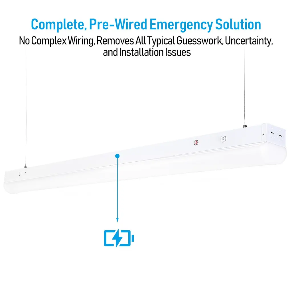 Emergency Battery BackupThis linear strip light comes equipped with a built-in emergency battery, providing over 90 minutes of illumination during power outages. Its UL1598 certification guarantees safety, making it ideal for commercial environments like offices, schools, hospitals, hallways, and workshops.Commercial LED Light (120-277V)Built for wide voltage compatibility, this LED strip fixture operates on 120-277V AC, making it perfect for commercial lighting applications such as warehouses, parking garages, corridors, and industrial workspaces, delivering reliable and efficient illumination3500K/4000K/5000K SelectableEffortlessly switch between 3500K, 4000K, and 5000K to achieve the desired lighting for offices, classrooms, and retail spaces. This selectable color temperature feature allows for tailored brightness and ambiance to suit various environments.Selectable Wattage & Smooth DimmingChoose from 25W, 30W, or 40W settings with impressive lumen outputs of 3250lm, 3900lm, and 5200lm. The 0-10V dimmable function enables precise brightness control, making it perfect for task lighting in commercial and industrial settings.Flexible Mounting OptionsEngineered for hassle-free installation, this LED linear strip light supports both surface mounting and suspended mounting. It’s ideal for commercial, industrial, and retail lighting, providing bright, efficient, and adaptable illumination across different settings.SpecificationsWattage: 25W/30W/40W Voltage: AC 120-277V Equivalent: 240W Luminous flux: 3250lm/3900lm/5200lm Lifespan: 50,000 hrsBeam angle: 120°CCT: 3500K/4000K/5000K Dimming range: 10%-100%Working temp: -40°F-113°FMaterial: SPCC & PC