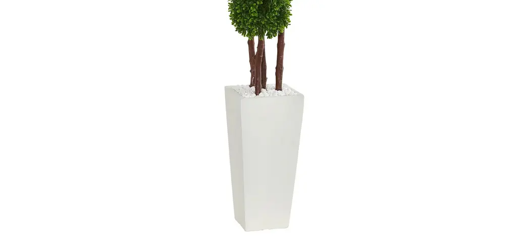 The contrast between the white planter and green foliage in this 4ft Boxwood Topiary Artificial Tree in Planter UV Resistant (Indoor/Outdoor) will recreate a clean and fresh feel in your home or office. Natural looking thin stems and white rocks finish off this crisp look. Place in a corner to brighten up any dark spaces.