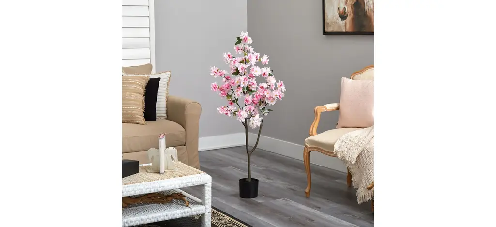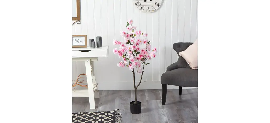 Enjoy the wonders of the majestic spring awakening with this Cherry Blossom Artificial Tree. Incredibly lifelike pink cherry blossom flowers adorn a slim, brown trunk in a rhythmic melody of pink foliage for a full look that will instantly transform your home into the best of Japan. The pink flowers have shades of white and are accented by green leaves for a feminine touch that softens spaces. Standing 4' from a nursery planter (included in height), curate in tight areas that want to feel pretty in pink. Perfect for bedrooms, bathrooms, awkward corners, or kitchen nooks.