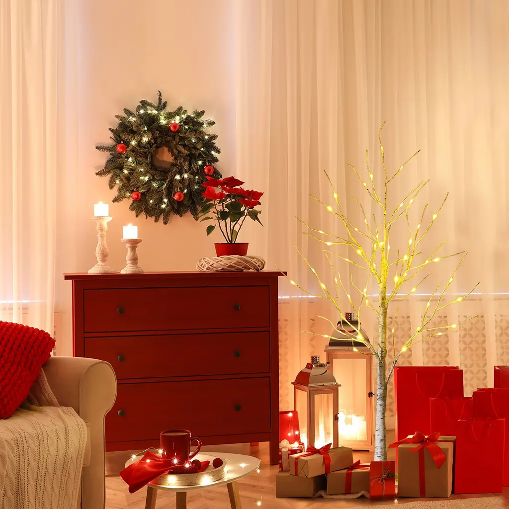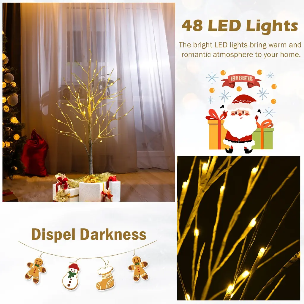 Our lighted twig birch tree is exquisitely crafted, which must be must your ideal choice to spend a wonderful holiday! The tree is made of recyclable material, which will work for a long time without deforming or fading. Besides, the vivid birch bark texture and 48 LED lights warped on branches create a natural and romantic atmosphere for your home on various holidays and festivals. What's more, certified by UL, the adaptor has a long cord of 6 feet. Therefore, you can move the tree freely within the range of cord length to decorate your room! Take it at home and warm up holiday atmosphere. Features: Specification