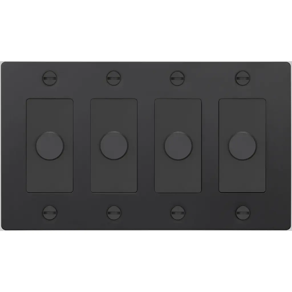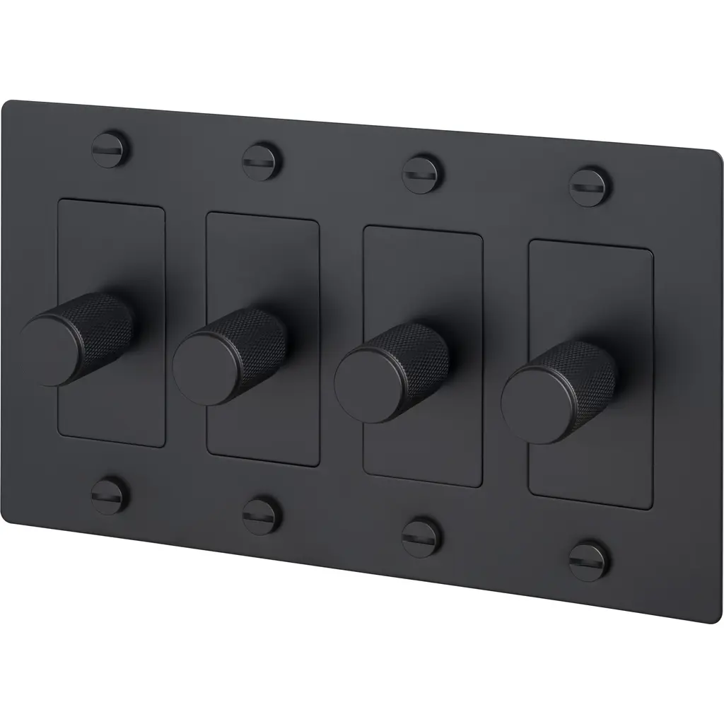 A dimmer switch finished in black. The dimmer knob features our signature, diamond-cut, cross knurl pattern and is made from solid black metal.FYI: This piece has a 4 mm shadow gap when installed.