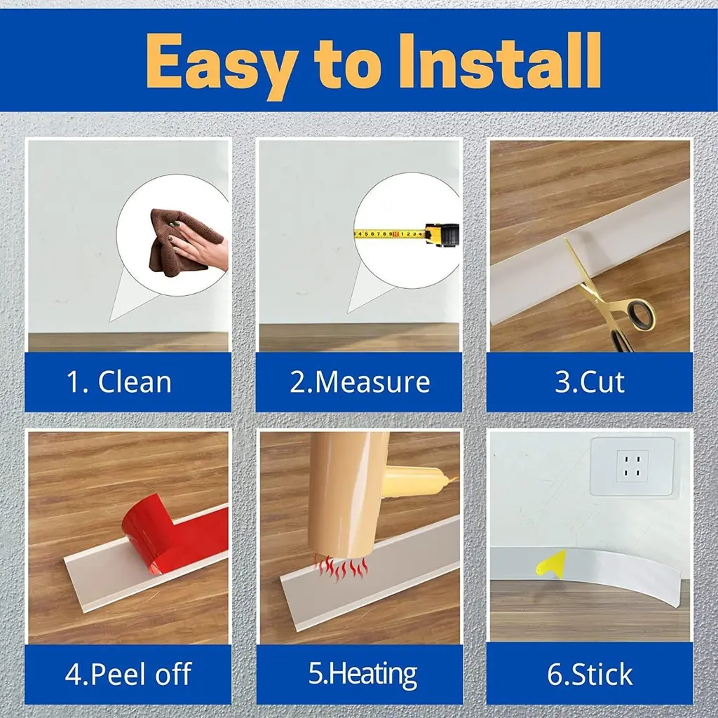 Flexible & Easy to Install - Made from bendable PVC, this baseboard moulding easily conforms to curved walls and uneven surfaces for a seamless fit. No special tools required—just peel and stick for quick installation. Self-Adhesive Backing - Features a strong adhesive layer for hassle-free application. Simply remove the protective film, align, and press firmly for a secure, long-lasting hold. Durable & Waterproof - PVC construction resists moisture, mold, and daily wear, making it ideal for kitchens, bathrooms, and high-traffic areas. Easy to clean with a damp cloth. Sleek White Finish - Provides a smooth, modern look that complements any decor. Perfect for covering gaps between walls and floors while adding a polished touch. Versatile & Trim-to-Fit - Can be cut to any length with scissors or a utility knife. Works on various surfaces, including drywall, tile, and wood—great for DIY home upgrades.