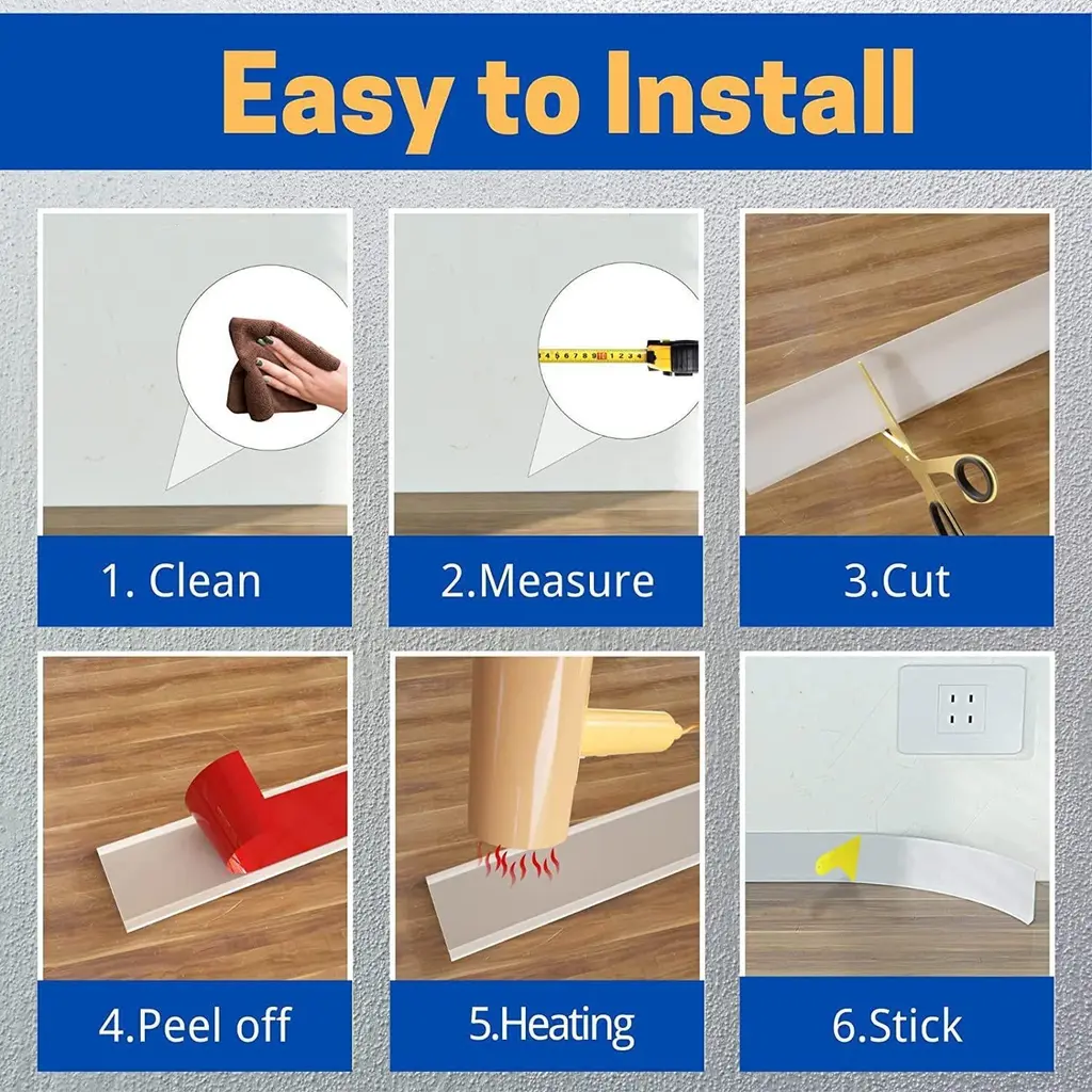 Flexible & Easy to Install - Made from bendable PVC, this baseboard moulding easily conforms to curved walls and uneven surfaces for a seamless fit. No special tools required—just peel and stick for quick installation. Self-Adhesive Backing - Features a strong adhesive layer for hassle-free application. Simply remove the protective film, align, and press firmly for a secure, long-lasting hold. Durable & Waterproof - PVC construction resists moisture, mold, and daily wear, making it ideal for kitchens, bathrooms, and high-traffic areas. Easy to clean with a damp cloth. Sleek White Finish - Provides a smooth, modern look that complements any decor. Perfect for covering gaps between walls and floors while adding a polished touch. Versatile & Trim-to-Fit - Can be cut to any length with scissors or a utility knife. Works on various surfaces, including drywall, tile, and wood—great for DIY home upgrades.