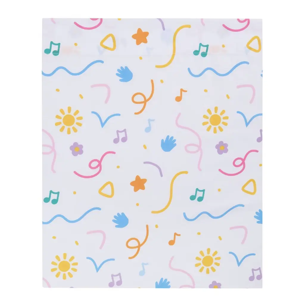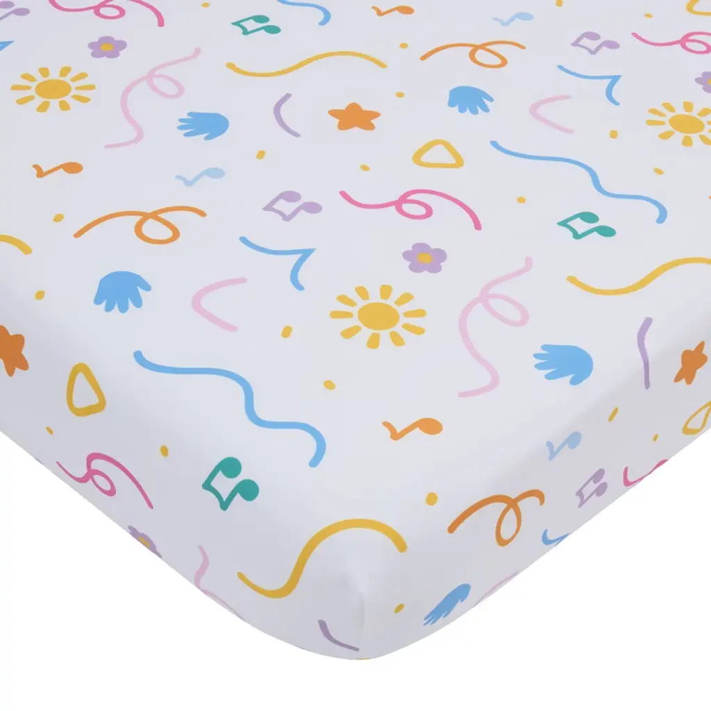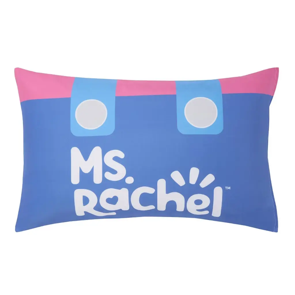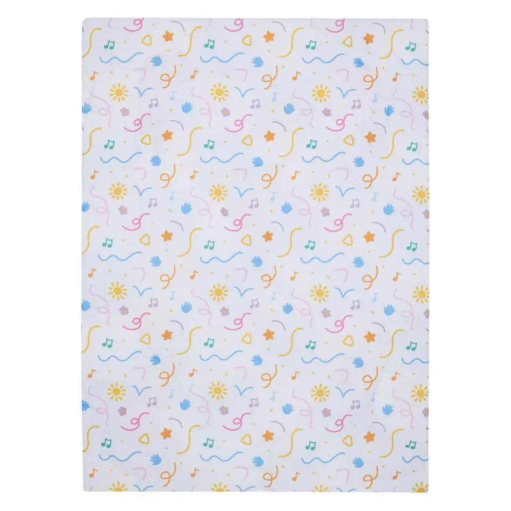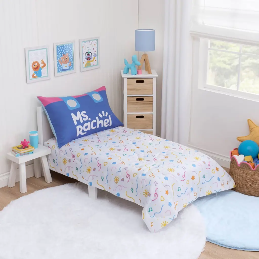 The NoJo Ms. Rachel "You're A Great Kid" 4-piece toddler bed set includes a reversible comforter, fitted and flat sheets, and a reversible pillowcase. Features bright, cheerful prints with Ms. Rachel, hearts, and music notes. Fits standard crib/toddler mattress. Colorful, fun, and toddler-approved! Fun and colorful designs of Ms. Rachel’s friendly face are sure to delight your toddler!