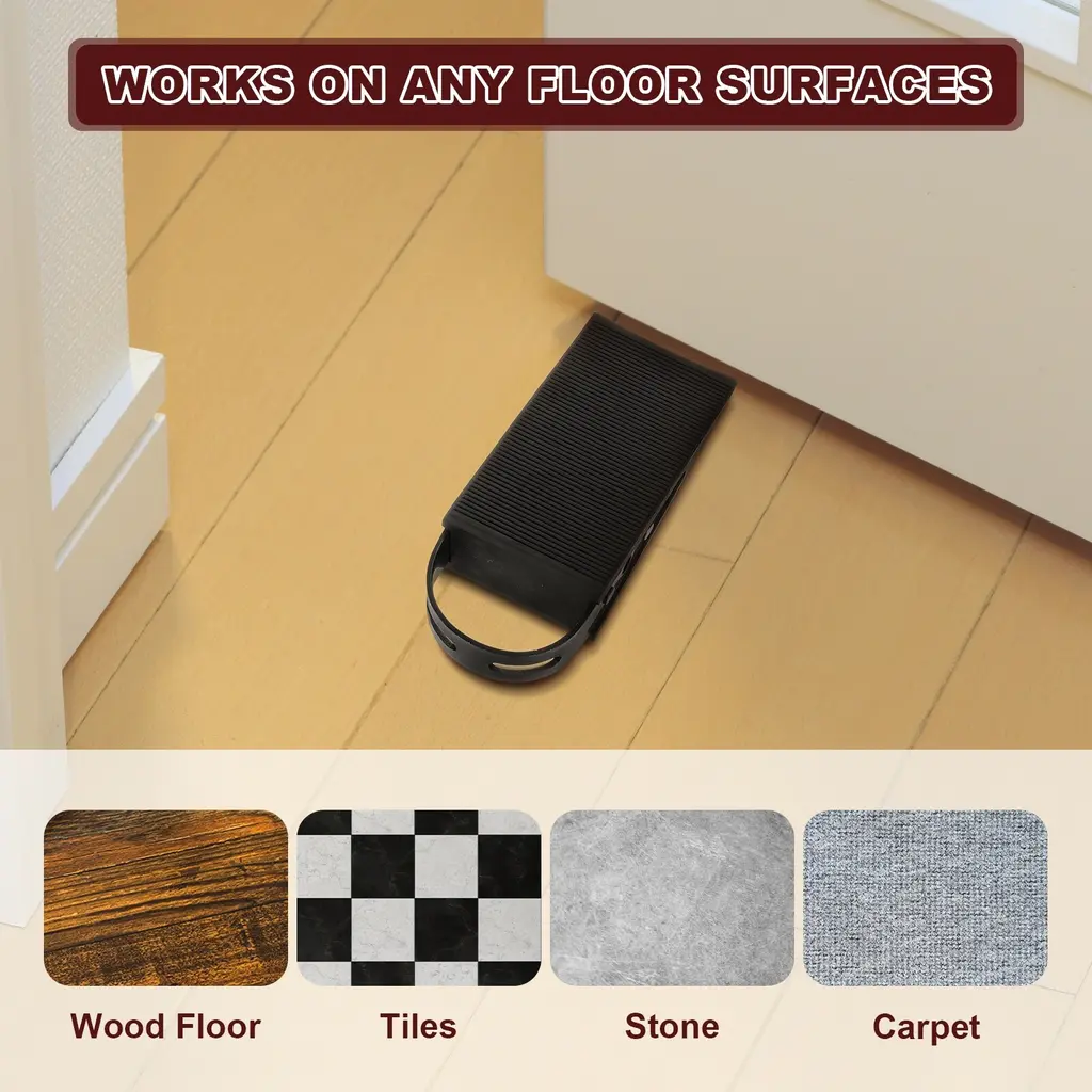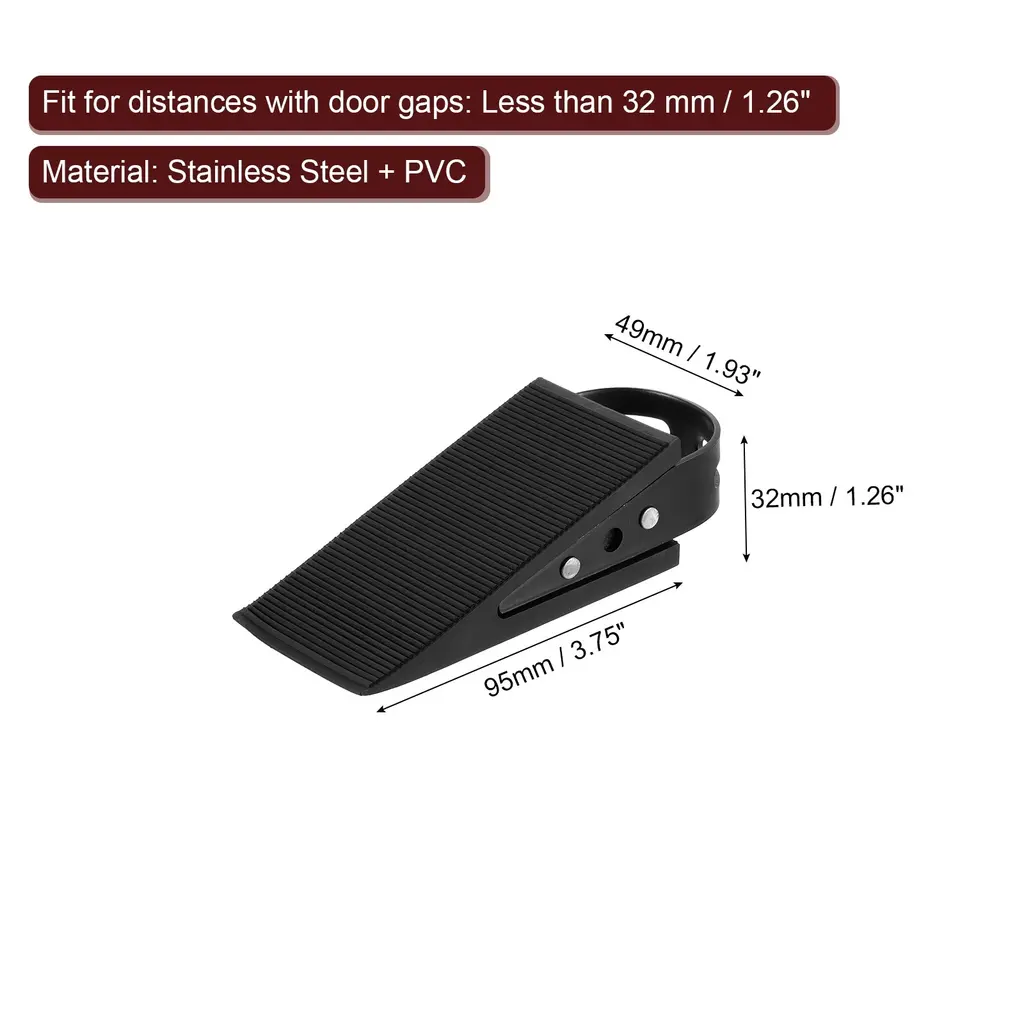 Description :Anti-Slip Design - The door stopper has a double-sided anti-slip function, with a horizontal stripe design on the surface, which increases the friction with the door and can easily fix the position of the door. The bottom hollowed-out anti-slip design keeps the door stable on the floor, with even force distribution during use, and is not easy to move.Material - The door stoppers for the bottom of the door are made of Stainless Steel + PVC, soft and non-slip, they will not scratch the surface of the floor or door; It has elasticity and can adapt to larger gaps, and can also be used on floors of various materials (wooden boards, ceramic tiles, and so on), and the trapezoidal design also provides cushioning force when closing the door.Easy Using - Place the door stopper on the floor at a suitable distance, which is easy to replace and does not affect cleaning. In addition to being used as a buffer and fixing when opening the door, it can also be used when closing the door to stop it from opening from the outside.Wide Applications - These door stops can be applied to various occasions, such as offices, homes, shops, hotels, etc; These door stops ensure that doors do not accidentally slip and close, so you don't have to worry about the door suddenly closing in winds, protecting the door and walls.Specifications:Material: Stainless Steel + PVCColor: Black Total Size: 95 mm x 49 mm x 32 mm / 3.75 Inch x 1.93 Inch x 1.26 Inch (L*W*H)Fit for distances with door gaps: Less than 32 mm / 1.26 InchPackage Content: 4 Pcs x Door Stoppers