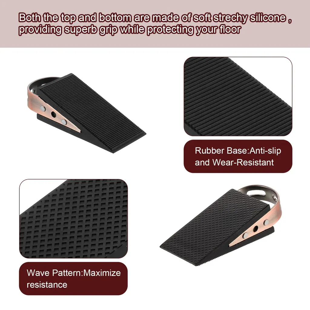Description :Anti-Slip Design - The door stopper has a double-sided anti-slip function, with a horizontal stripe design on the surface, which increases the friction with the door and can easily fix the position of the door. The bottom hollowed-out anti-slip design keeps the door stable on the floor, with even force distribution during use, and is not easy to move.Material - The door stoppers for the bottom of the door are made of Stainless Steel + PVC, soft and non-slip, they will not scratch the surface of the floor or door; It has elasticity and can adapt to larger gaps, and can also be used on floors of various materials (wooden boards, ceramic tiles, and so on), and the trapezoidal design also provides cushioning force when closing the door.Easy Using - Place the door stopper on the floor at a suitable distance, which is easy to replace and does not affect cleaning. In addition to being used as a buffer and fixing when opening the door, it can also be used when closing the door to stop it from opening from the outside.Wide Applications - These door stops can be applied to various occasions, such as offices, homes, shops, hotels, etc; These door stops ensure that doors do not accidentally slip and close, so you don't have to worry about the door suddenly closing in winds, protecting the door and walls.Specifications:Material: Stainless Steel + PVCColor: Black Total Size: 95 mm x 49 mm x 32 mm / 3.75 Inch x 1.93 Inch x 1.26 Inch (L*W*H)Fit for distances with door gaps: Less than 32 mm / 1.26 InchPackage Content: 4 Pcs x Door Stoppers