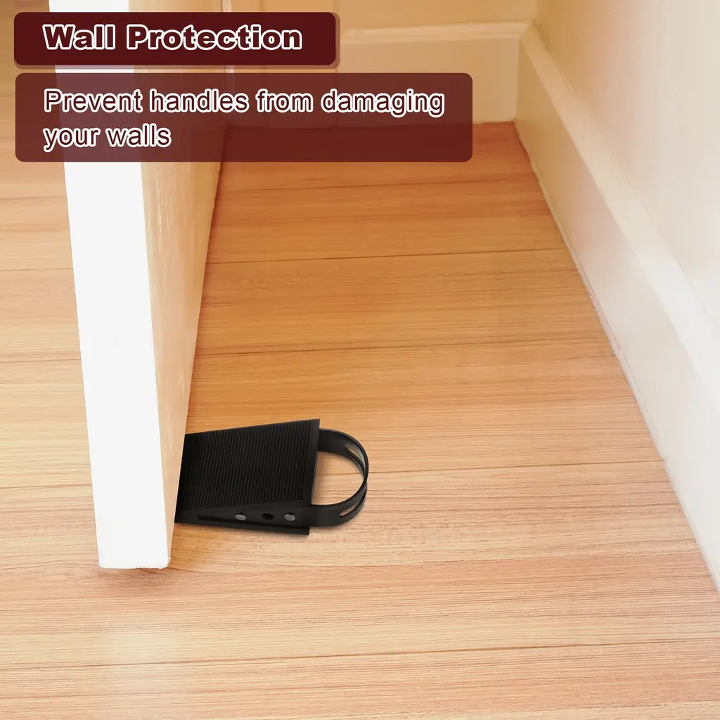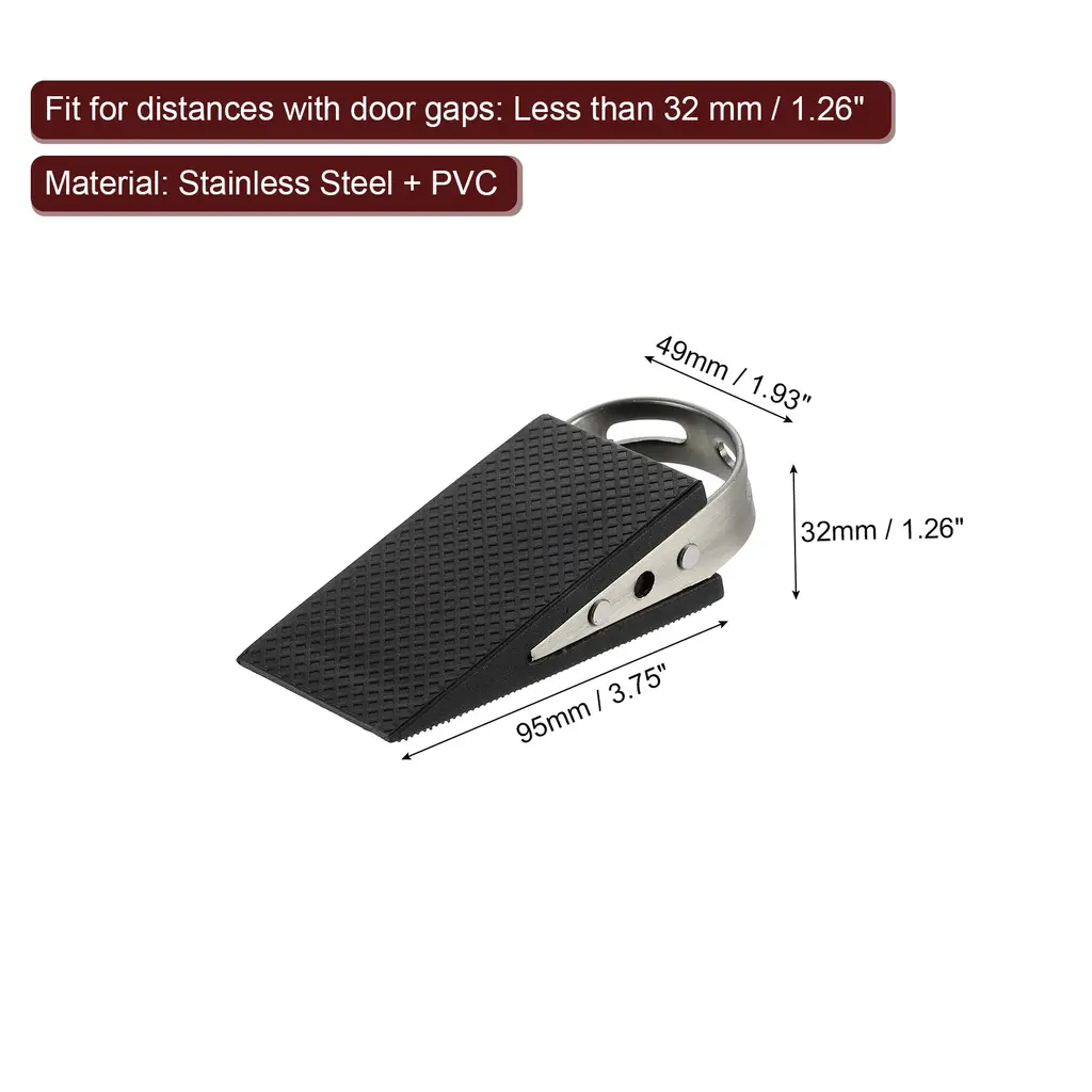 Description :Anti-Slip Design - The door stopper has a double-sided anti-slip function, with a horizontal stripe design on the surface, which increases the friction with the door and can easily fix the position of the door. The bottom hollowed-out anti-slip design keeps the door stable on the floor, with even force distribution during use, and is not easy to move.Material - The door stoppers for the bottom of the door are made of Stainless Steel + PVC, soft and non-slip, they will not scratch the surface of the floor or door; It has elasticity and can adapt to larger gaps, and can also be used on floors of various materials (wooden boards, ceramic tiles, and so on), and the trapezoidal design also provides cushioning force when closing the door.Easy Using - Place the door stopper on the floor at a suitable distance, which is easy to replace and does not affect cleaning. In addition to being used as a buffer and fixing when opening the door, it can also be used when closing the door to stop it from opening from the outside.Wide Applications - These door stops can be applied to various occasions, such as offices, homes, shops, hotels, etc; These door stops ensure that doors do not accidentally slip and close, so you don't have to worry about the door suddenly closing in winds, protecting the door and walls.Specifications:Material: Stainless Steel + PVCColor: Black Total Size: 95 mm x 49 mm x 32 mm / 3.75 Inch x 1.93 Inch x 1.26 Inch (L*W*H)Fit for distances with door gaps: Less than 32 mm / 1.26 InchPackage Content: 4 Pcs x Door Stoppers
