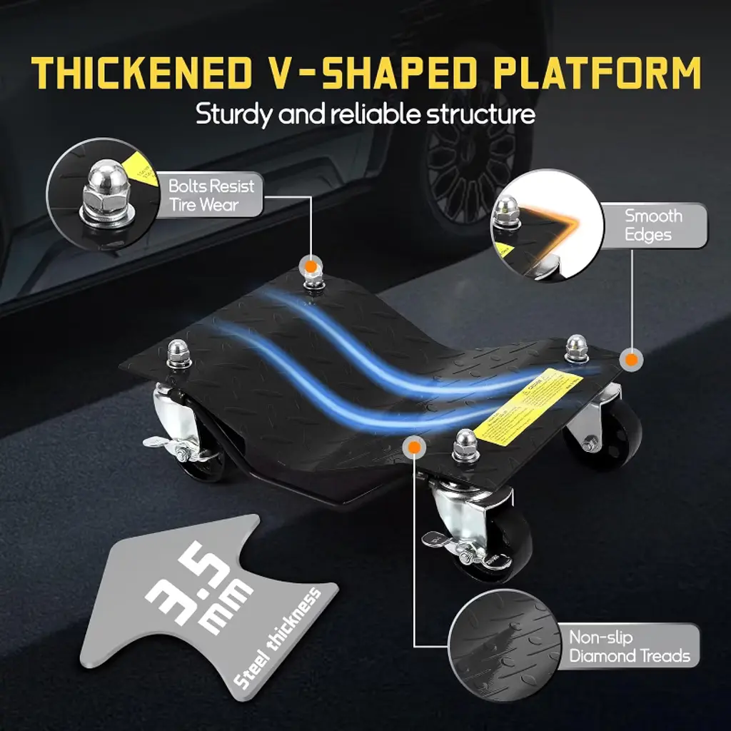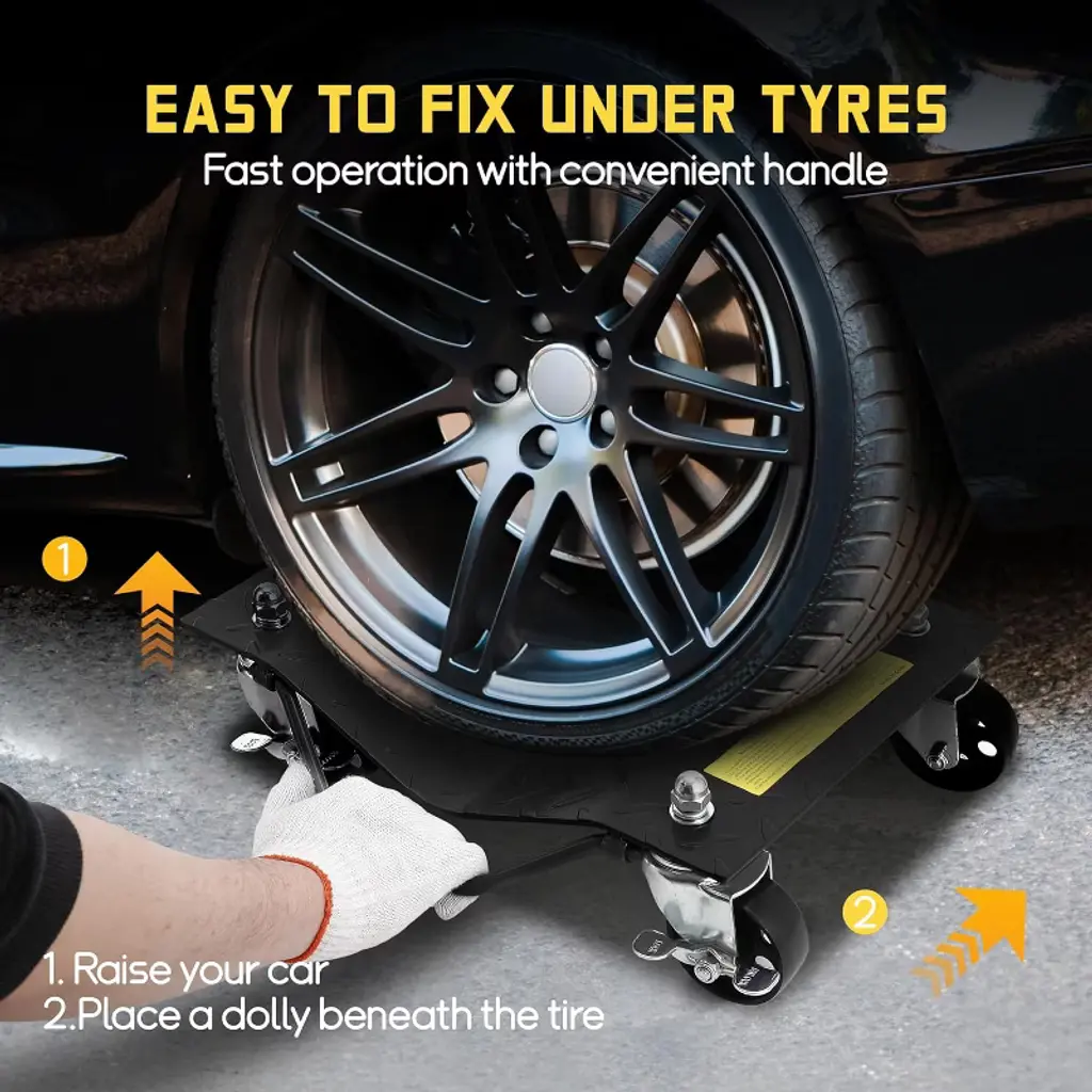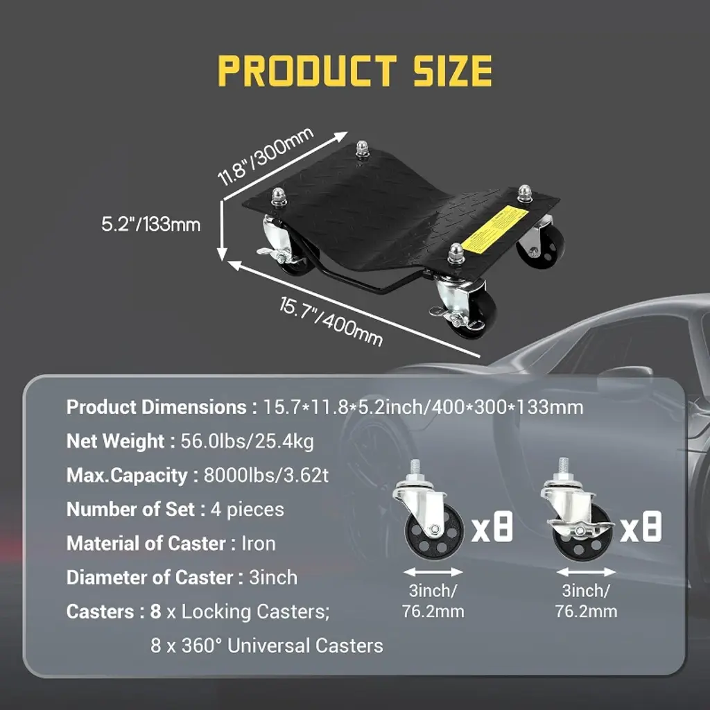 Material: Reinforced Alloy Steel Capacity: 2,000lbs/dolly (8,000lbs/set) Wheels: 2/4x 3" Swivel Casters (2 locking/dolly) Dimensions: 15.7" L x 11.8" W x 5.2" H Weight: 12 lbs/dolly (48 lbs/set) Tire Width Range: 6" - 12" Ideal For: Garage mechanics and auto shops RV and boat storage facilities Tire changes and brake jobs Vehicle detailing and restoration Maximizing tight parking spaces