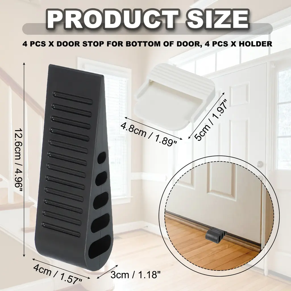 The rubber door stops offer a secure hold on various floor surfaces, including wood, carpet, cement, tile, and stone. These versatile tools effectively keep doors open while adding a touch of practical elegance to any space.SpecificationColor: BlackMaterial: TPRDoorstop Size: 12.6 x 4 x 3 cm / 4.96 x 1.57 x 1.18 Inch (L*W*H)Holder Size: 5 x 4.8 x 1 cm / 1.97 x 1.89 x 0.39 Inch (L*W*H)Packing List: 4 Pcs x Door Stop for Bottom of Door, 4 Pcs x Holder Advantages[Sturdy Rubber] The door stop wedges are crafted from TPR material, ensuring reliability, reusability, and non-slip. Suppleness structure with scientific arched holes, effectively preventing doors from closing due to a breeze and helping prevent cats and dogs from accidentally pushing the door closed.[Silent & Convenient Storage] With a unique wedge-sloped design, these rubber door stops offer excellent grip without scratching floors, walls, or doors. They provide effective noise reduction and come with a self-adhesive holder for easy hanging and storage, keeping your space organized and the doorstop readily accessible.InstructionEasy to use and store. Place it at the bottom of your door and let the wedge get stuck without the need for drilling holes or using adhesive tape. You can store the door stoppers in the holder when not in use.NOTE: Before choosing our products, please confirm whether the size you need is suitable.