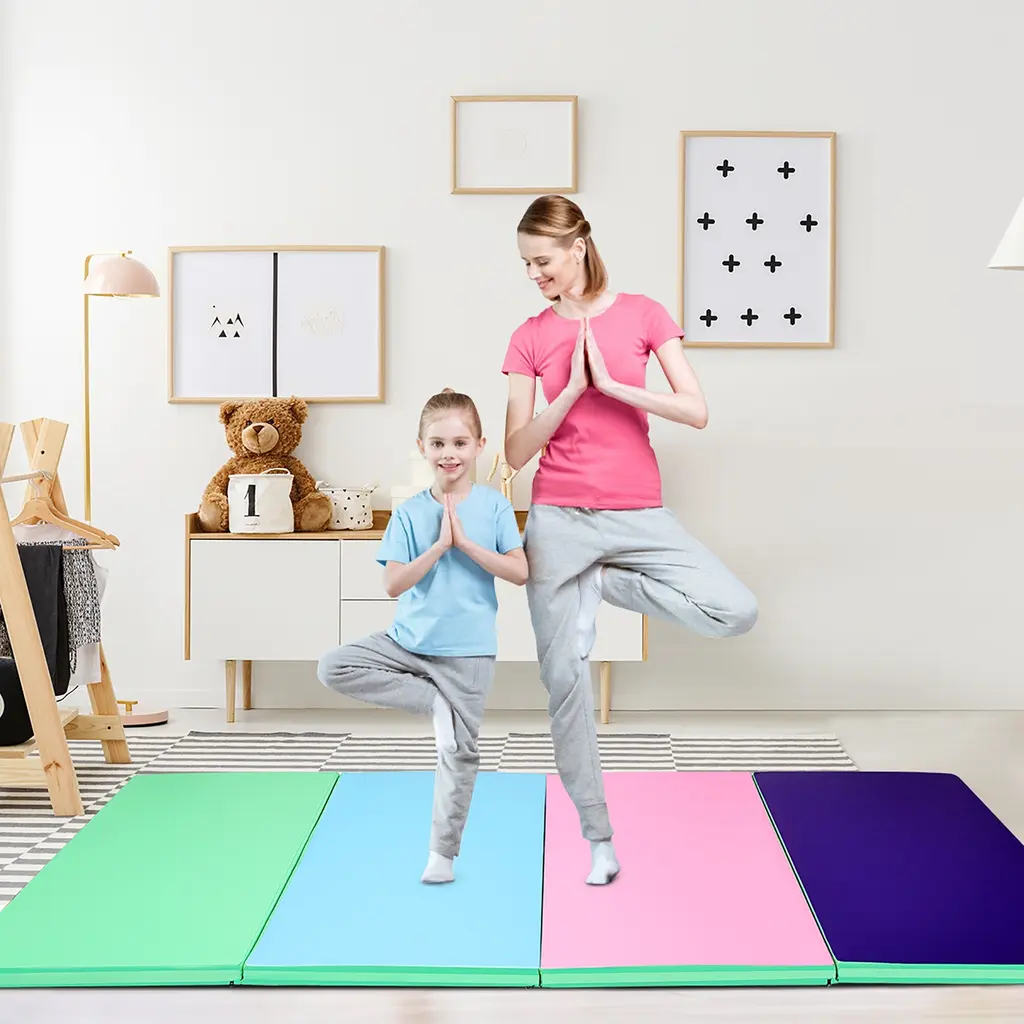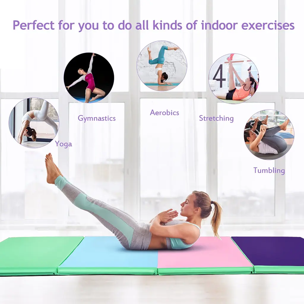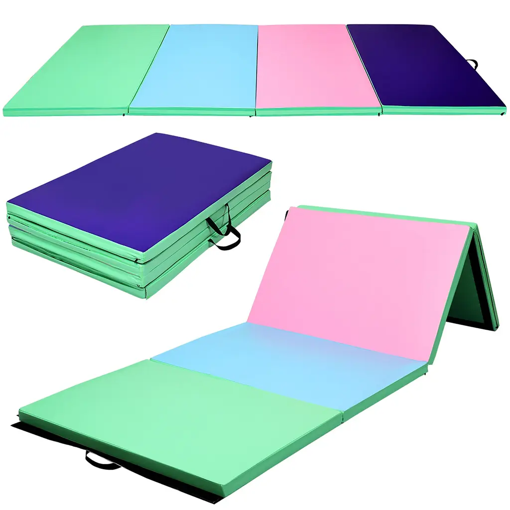 DescriptionOur mat is made of high quality PU material which has a waterproof surface. It is easy to clean. Its foldable design saves space and is easy to store and carry. It is ideal for multiple exercise, not only for gymnastics but also for pilates, stretching, yoga, martial arts, day care activities and many other general exercise, all in one mat.Features Exercise with Comfort: Our folding gymnastics is made from eco-friendly PU cloth and high-quality EPE foam, with our gymnastics mat, it will ease the pain for any hard falls, also it can reduce injury rate when you are doing exercise.Widely Use: Our gymnastic mat is ideal for multiple exercise, not only for gymnastics but also for pilates, stretching, yoga, martial arts, day care activities and many other general exercise, all in one mat. Also it is ideal for teaching basic gymnastics and exercises to kids.Lightweight and Portable: Our mat is light in weight, with hook and loop fastener on two edges to connect end to end, which allows for multiple units to be connected together so that it is easy for transport, you can take it anywhere.Easy To Storage and Clean: This gymnastic mat can be folded into 4 quarters for easy carry and storage, it can be folded to fit into compact spaces.There is a zippered cover in each mat, so it can be easily removed and is machine washable. SpecificationColor: Multicolor/Purple+Pink/Green+Blue+Pink+Purple/Blue/BlackMaterial: EPE, PUProduct Size: 4' x 10' x 2'' (L x W x H)Folded Dimensions: 4' x 2.5' x 8'' (L x W x H)Net Weight: 15lbsPackage includes:1 x Folding Exercise Mat1 x User's Manual