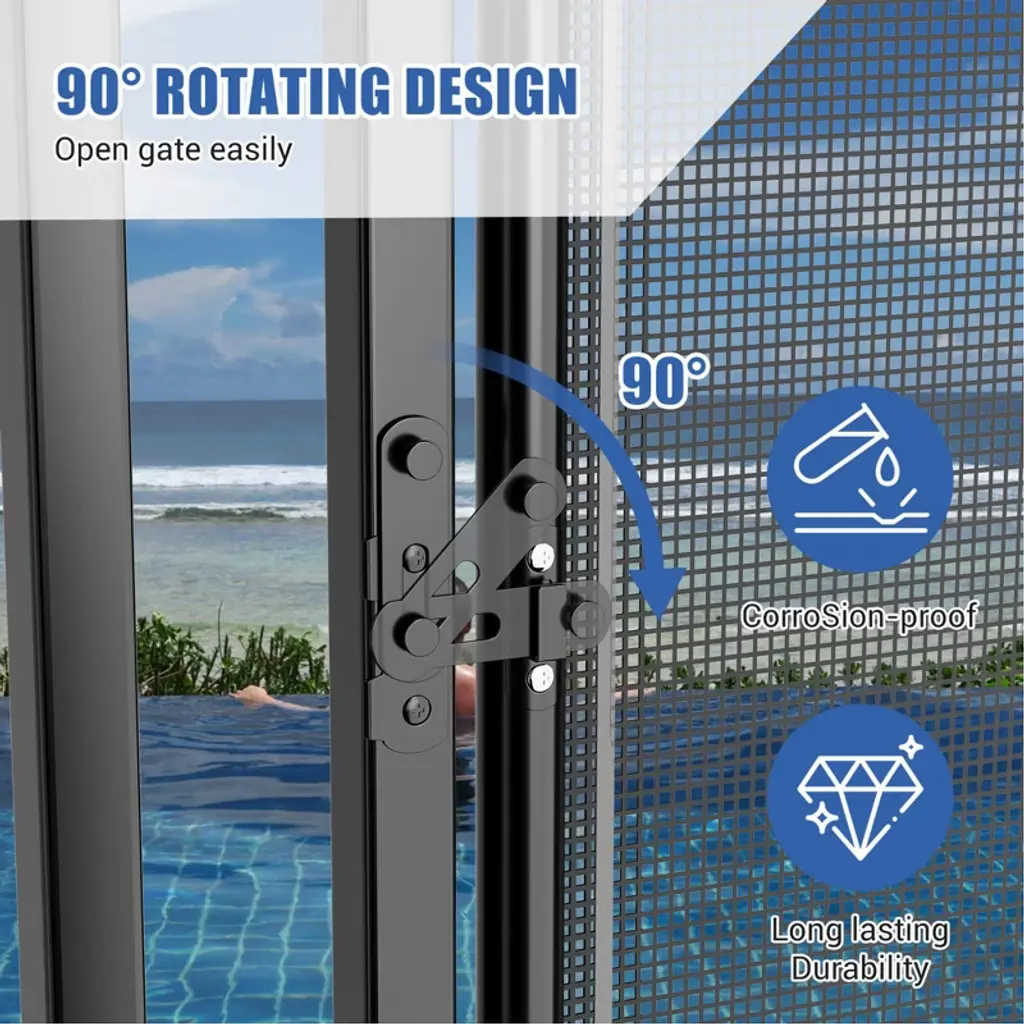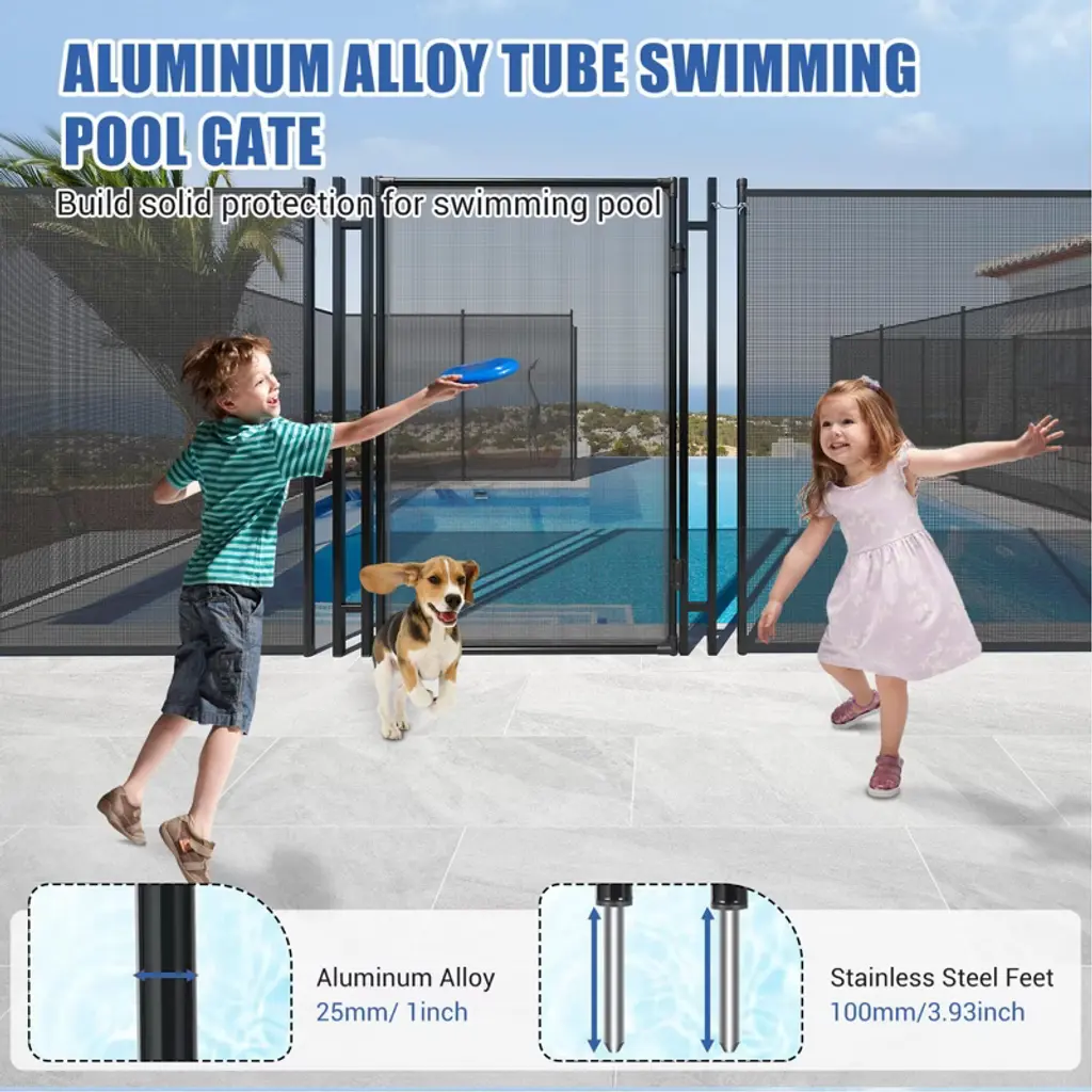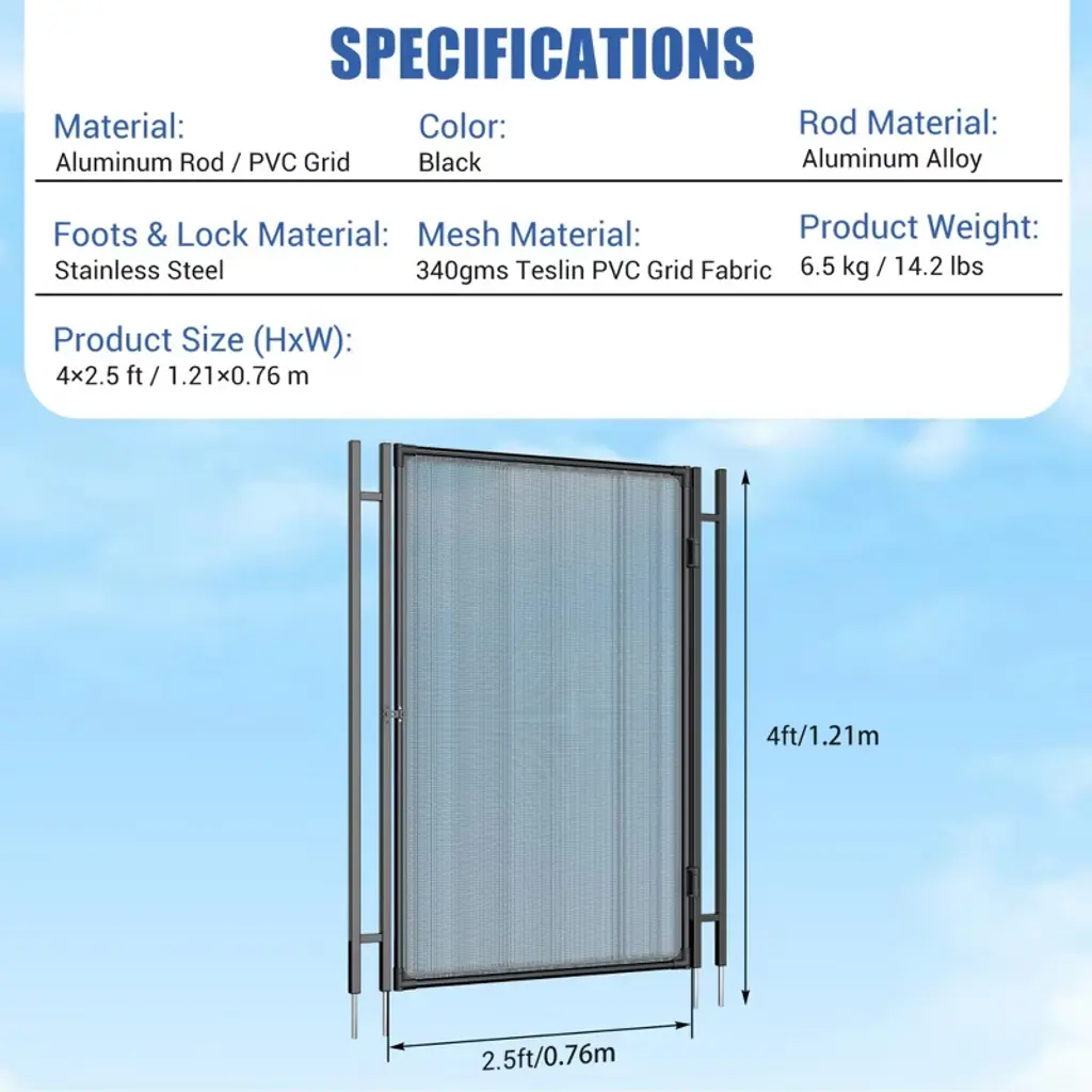 4x2.5 FT Pool Fence Gate – Safety Gate with Easy Install & LockWant easy access to your pool without compromising safety? Discover how our 4x2.5 FT pool gate combines secure entry with a smooth-opening latch for your family's convenience!Worried about durability or weather resistance? See how our premium aluminum frame, stainless steel legs, and 340 GMS Teslin mesh keep your entryway sturdy and stylish, season after season!Think pool gate installation is complicated? Find out how our complete DIY kit with clear instructions lets you upgrade your pool safety in minutes—no professional help needed!Specification:Material: Aluminum+340GMS Teslin PVC Grid+Stainless SteelDimension: 4x2.5 FTPacking List:1xPool Fence Gate1xAssembly Kit1xInstruction ManualNote:Please ensure that this gate is compatible with your existing pool fence system in terms of height, material, and connection type before purchase.For safety and stability, install the pool fence gate on solid and level ground, such as concrete or other hard surfaces.The pool gate can enhance safety but is not a substitute for adult supervision. Always monitor children and pets around the pool area.