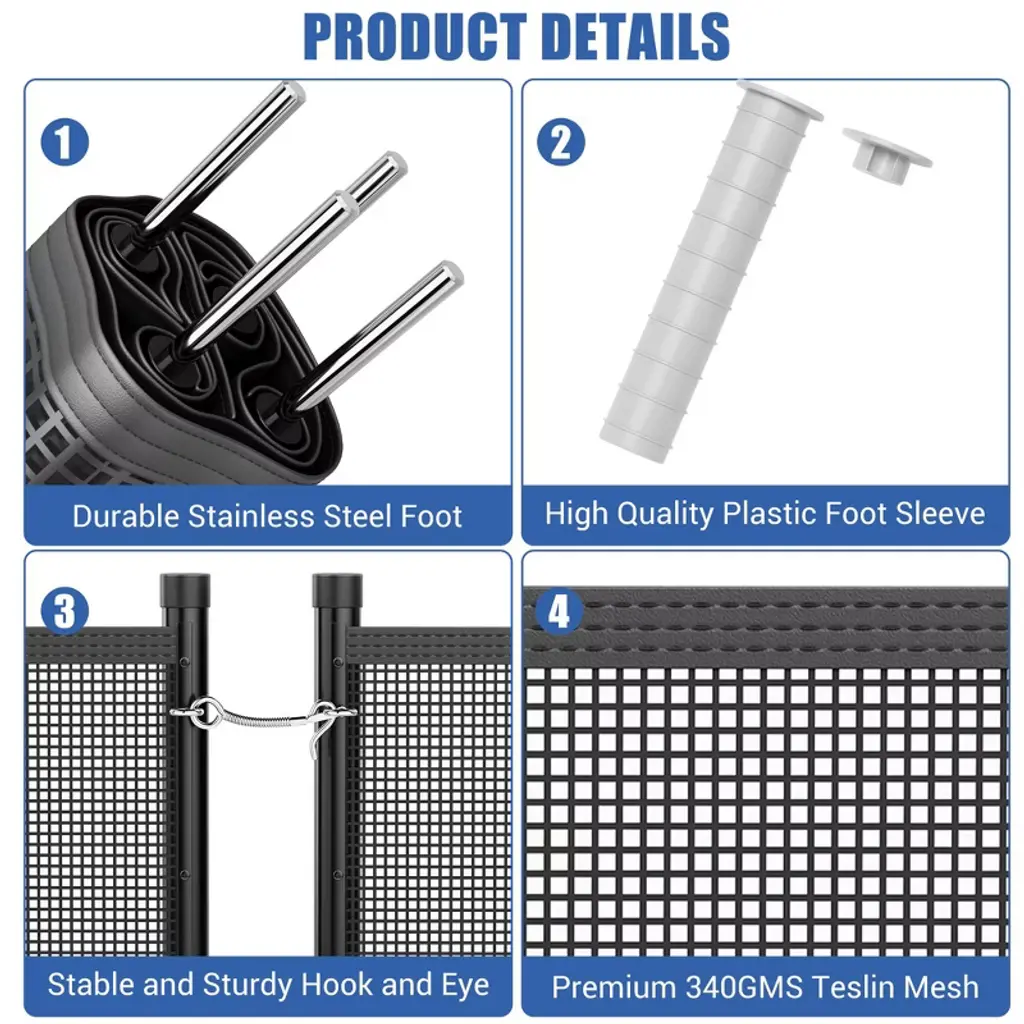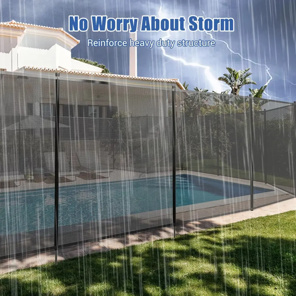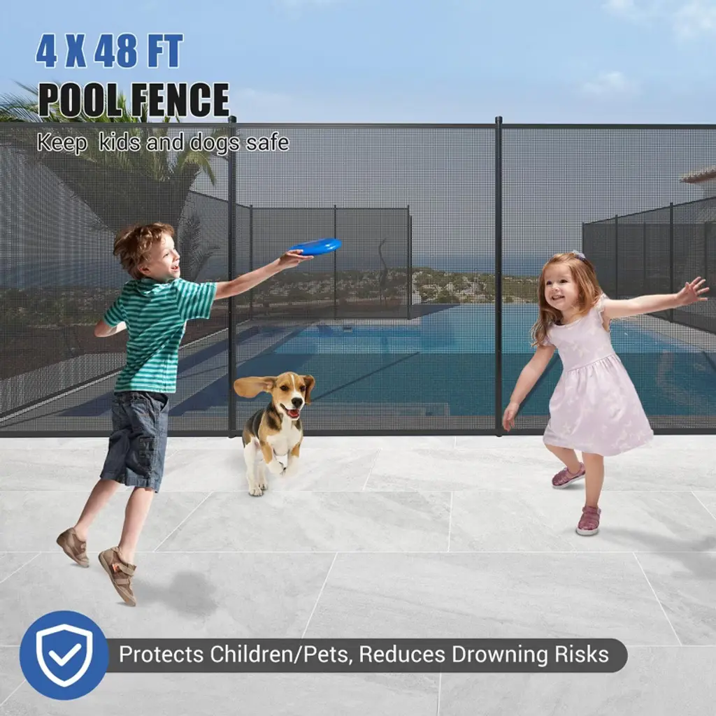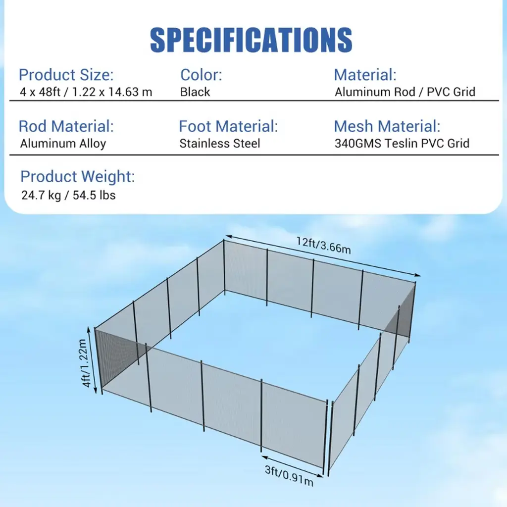 Pool Safety Fence – Easy Install Mesh Barrier for Kids & PetsWorried about kids or pets wandering near your pool? Discover how our sturdy mesh safety fence creates a secure barrier—giving you peace of mind every swim season!Looking for an easy way to upgrade pool safety without the hassle? See how our fence features quick DIY installation—no professional tools or skills required!Want a fence that lasts through sun, rain, and splashes? Find out why our premium Teslin PVC mesh and strong legs deliver long-lasting durability and reliable protection for your family!Specification:Material: Aluminum+340GMS Teslin PVC Grid+Stainless SteelDimension: 4x48 FTPacking List:1xPool Fence1xAssembly Kit1xInstruction ManualNote:Please measure your pool area carefully to ensure you order the correct length and height of fencing needed.Pool fencing helps increase safety, but it is not a substitute for adult supervision. Always watch children and pets around the pool.This pool fence is designed for easy DIY installation, but basic tools and skills may be required. Please read the instructions thoroughly before starting.