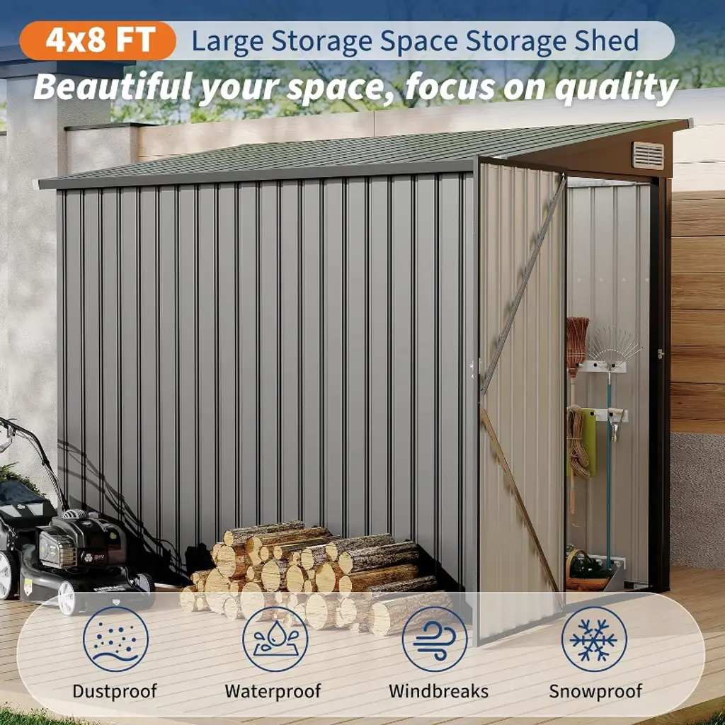 4X8 Ft Lean-to Metal Shed,heavy-duty Galvanized Steel Garden Tool Storage With Lockable Door & 2 Air Vents For Backyard, Garden, Patio