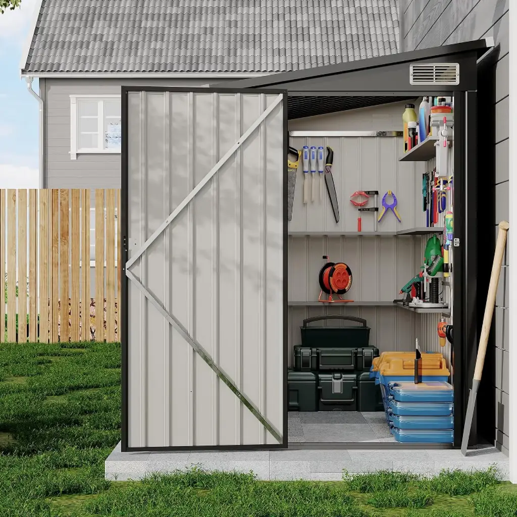 Our lean to metal shed is designed with practicality in mind. It features two air vents, one at the front and another at the back.The sturdy build makes it a reliable choice for long term use, safeguarding your stored items through various seasons and environmental challenges.The shed's walls can be customized by drilling holes to install shelves for additional storage. Alternatively, you can purchase separate freestanding.