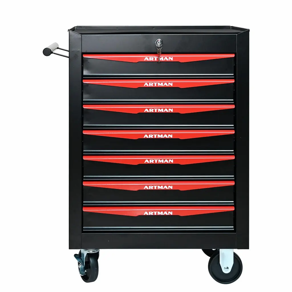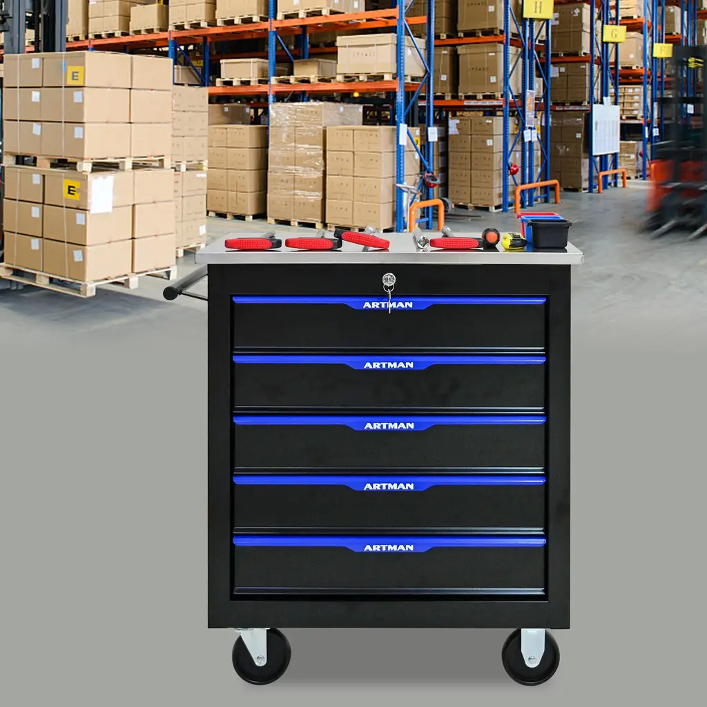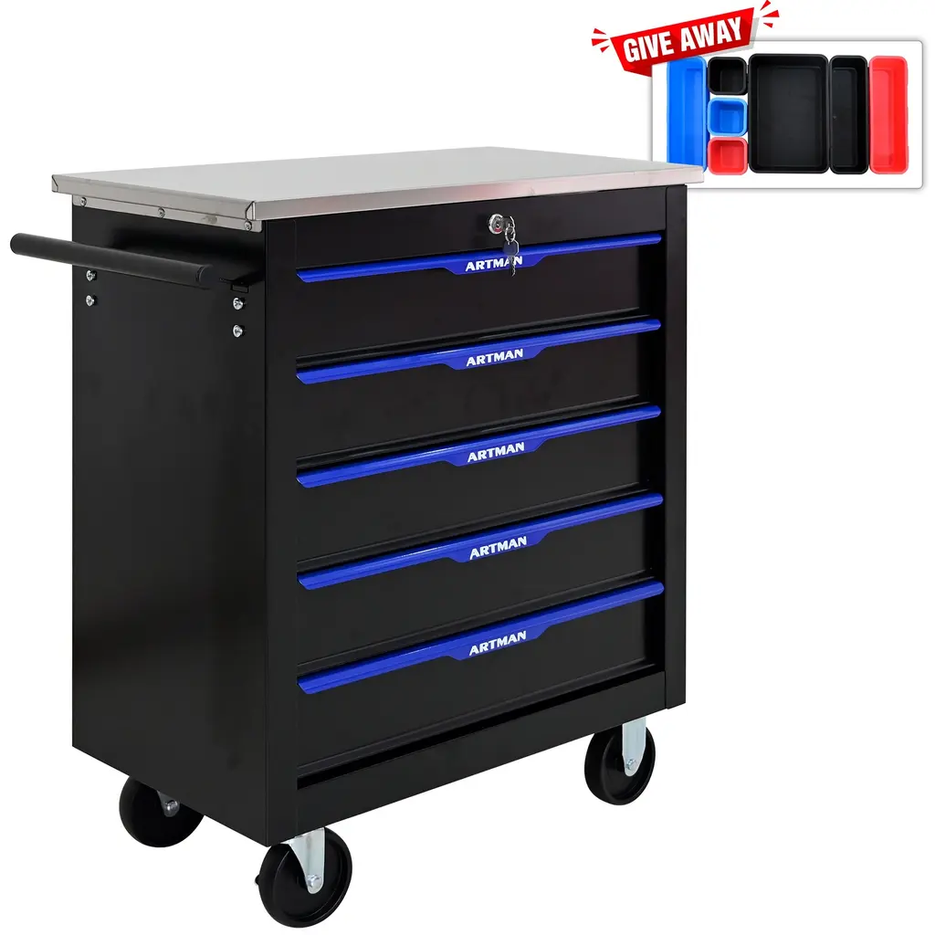 5 Drawers mutifunctional tool cart with wheels.The tool box is also lockable and can be used as a removable, attachable and mobile caseThe opening and closing of the drawers of the tool cabinet is very gentle thanks to the ball-bearing drawersThe robust and powder-coated steel construction is used for high wear resistance. This assembly trolley has 4 steering wheels, 2 of which with parking brakes, so you can move the trolley freely in the garage, but also stop in one placeThis is a set of cabinets, can use a round hook at the bottom of the table to connect another tool car, thus forming a combination.