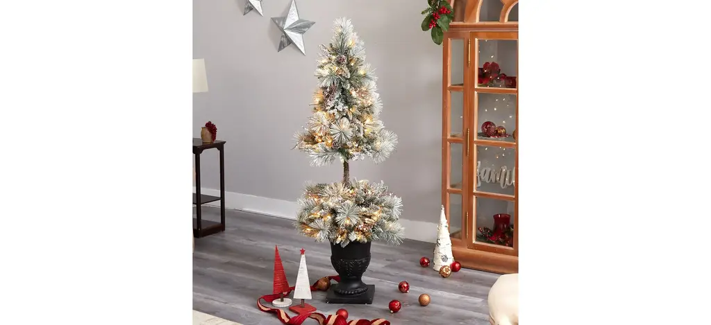 Are you dreaming of a white Christmas? This 5" Flocked Artificial Porch Christmas Tree with LED Lights and Bendable Branches in Decorative Urn transports you to a dreamy winter landscape. Two tiers of flocked branches sit on a thin trunk for a unique, festive look. Pre-strung with 100 lights, save the hassle of tangles. The 186 bendable branches are accented by pinecones and allow you to fit in your space and add your favorite ornaments. Perfect for a kids' room, office, apartment, or for a lonely corner that needs some Christmas cheer. Your artificial Christmas Tree will look beautiful for years to come; simply wipe clean with a soft dry cloth when needed.