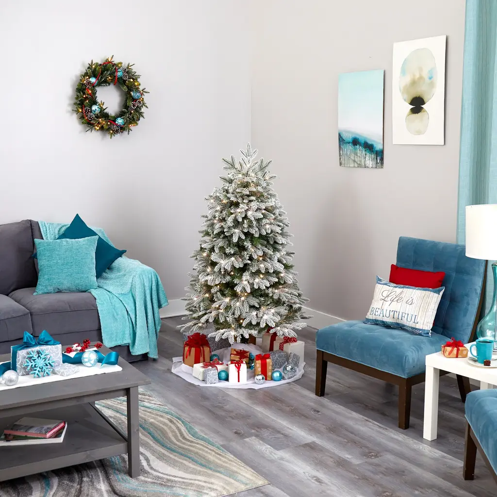 5' Flocked Colorado Mountain Fir Artificial Christmas Tree With 300 Warm White Microdot (Multifunction) Led Lights - White - Green