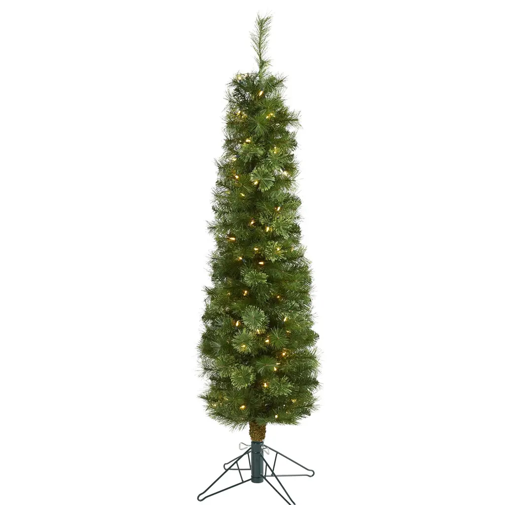 Create a traditional Christmas scene in a limited space environment with the help of this pencil slim artificial Christmas tree! Perfect for the smallest, tightest spaces because of its narrow, pencil-like design, it boasts spaced tiers of evergreen foliage made up of 198 easy-to-bend branch tips for showcasing all your favorite holiday ornaments. Pre-strung with 100 clear LED lights, it also features 8 different light options (including Twinkle, Bursts, and Fade) to create a true holiday glow wherever displayed. Carefully stabilized on a metal stand, this impressive, space-saving 5' tall artificial Christmas tree will make decorating a breeze for years to come.