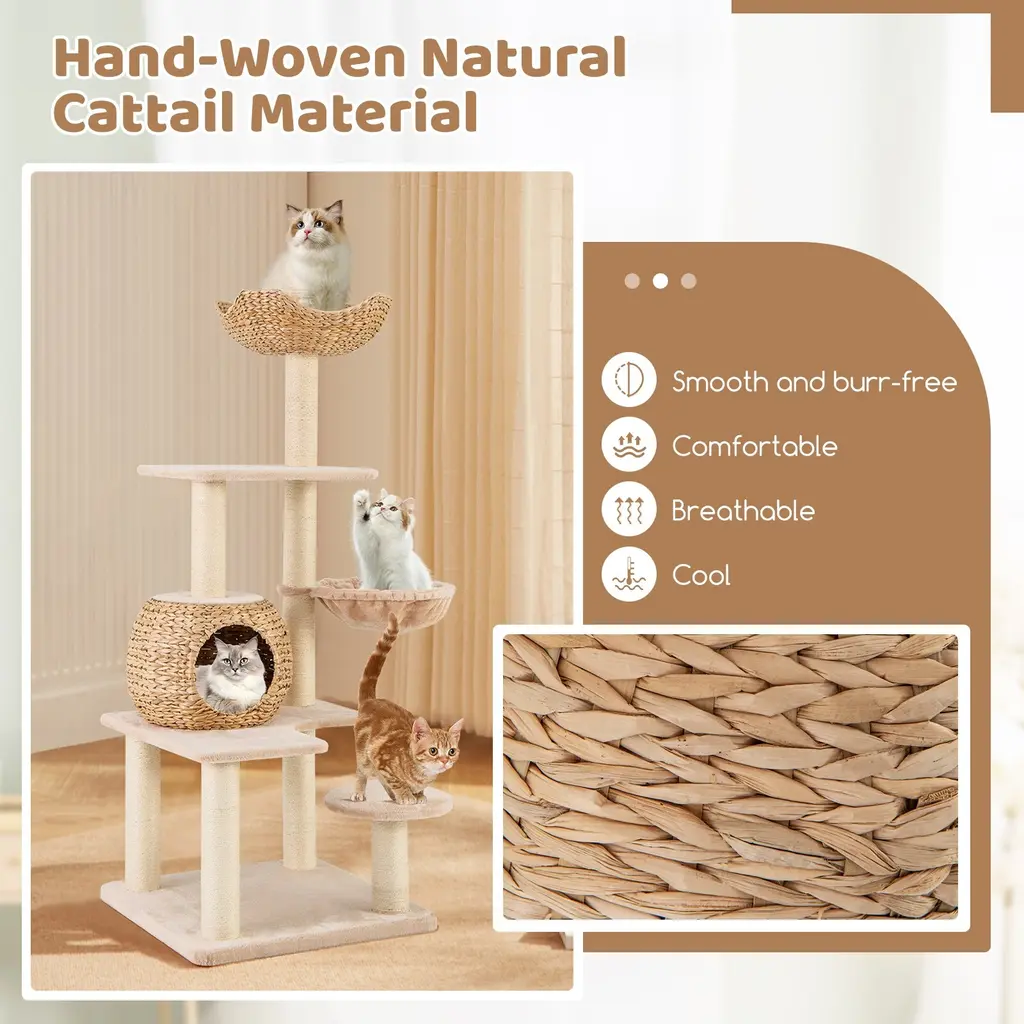 Specifications:Description:Introducing our 5-Layer Climbing Cat Tree, a perfect sanctuary for your feline friend. Standing at 59"/150 cm, this cat tower features multiple lounging areas, including a private condo for seclusion, a cozy top perch for panoramic views, and a soft hammock for ultimate relaxation. Equipped with 7 sisal-wrapped scratching posts, it helps maintain your cat's claw health while protecting your furniture. The sturdy construction includes breathable materials that keep your pet comfortable, while the plush, padded cushions offer a cozy resting spot. Its stylish design seamlessly fits into any home decor, and assembly is a breeze with the included illustrated manual. Upgrade your cat's playtime and naptime experience with this functional and attractive cat tree!Key Features: