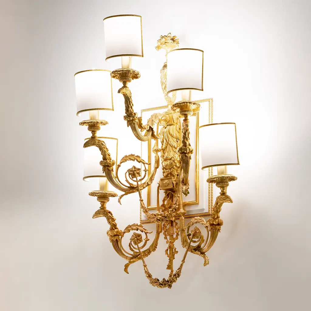 A marvelous design to showcase in a refined classic or modern entryway, hallway, or living room decor, this applique in 24K gold-plated bronze is comprised of five lights with white fabric shades.