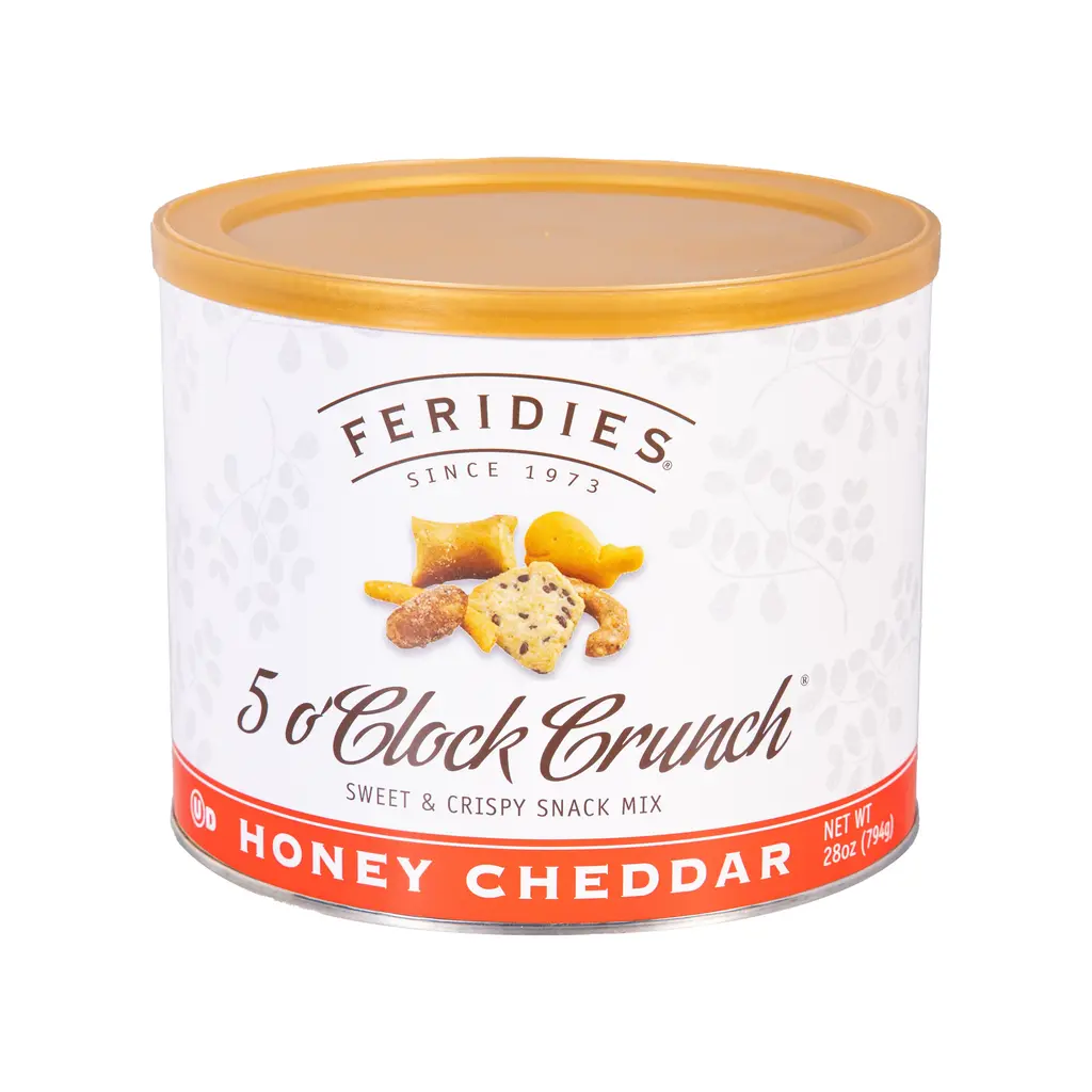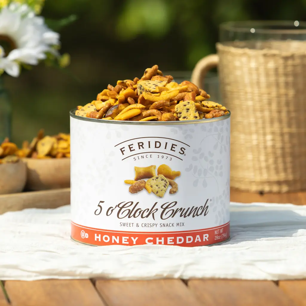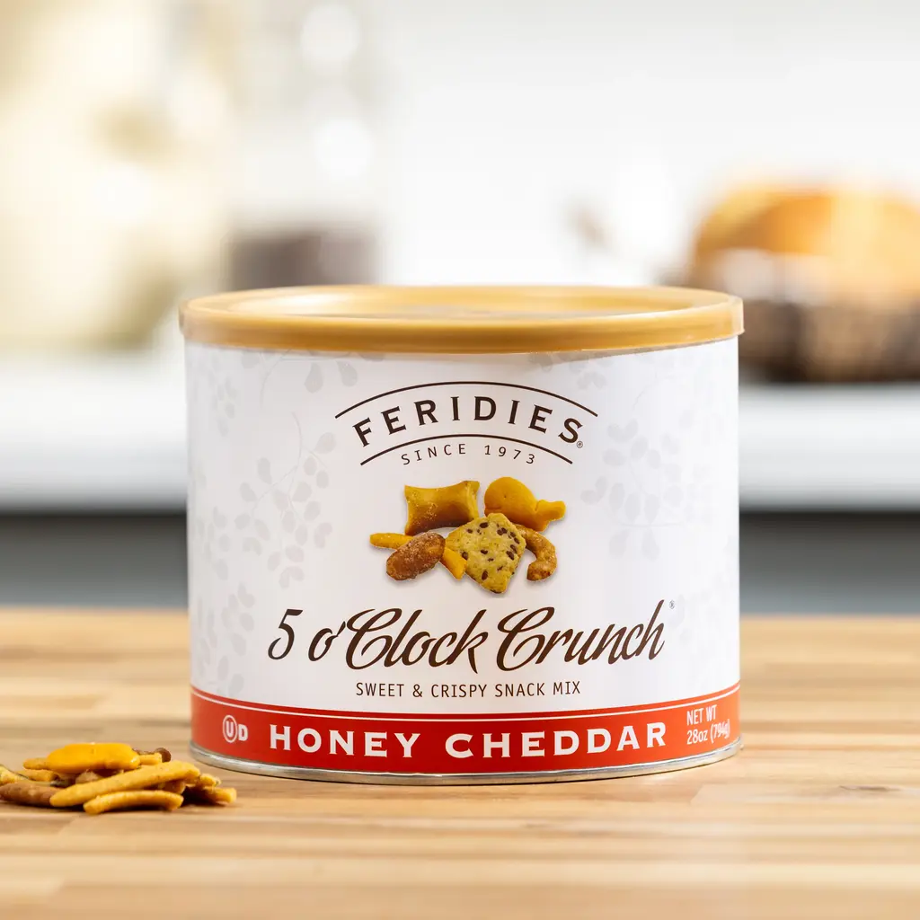 Snack time just got an upgrade with Feridies® 5 o'Clock Crunch Honey Cheddar Snack Mix! This irresistible 28 oz. tin is packed with the perfect sweet-and-savory balance of crunchy favorites—featuring honey-roasted sesame sticks, cheddar crackers, seasoned pretzels, corn sticks, and more. Each bite delivers bold cheddar flavor with a touch of honey sweetness for a taste that’s impossible to resist. Whether you're entertaining, road-tripping, or just looking for a satisfying afternoon pick-me-up, this gourmet snack mix is the ultimate go-to.