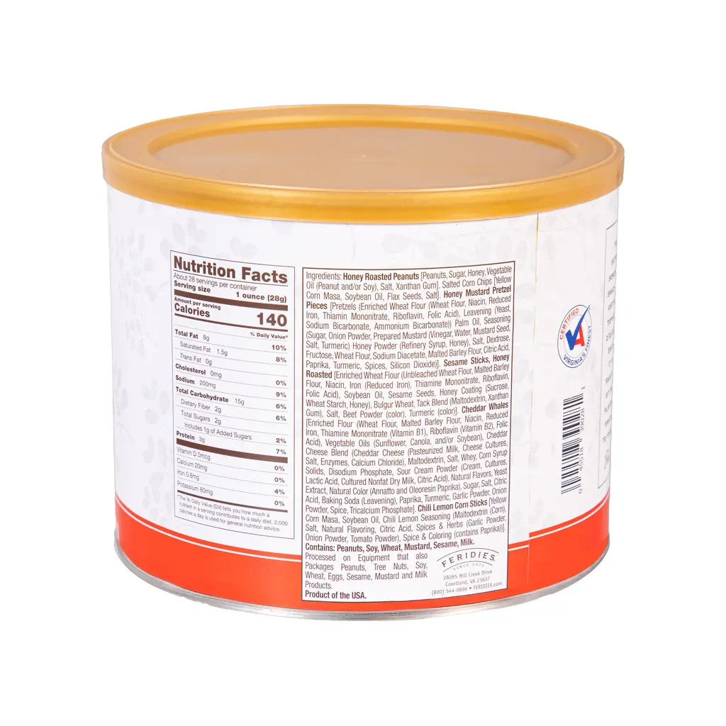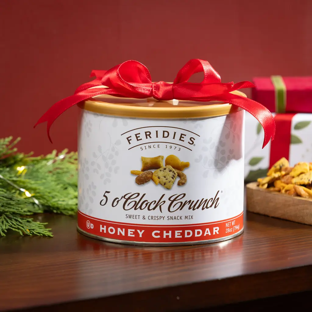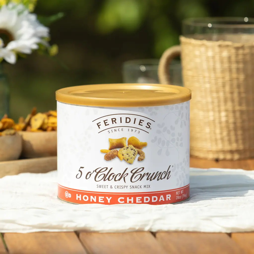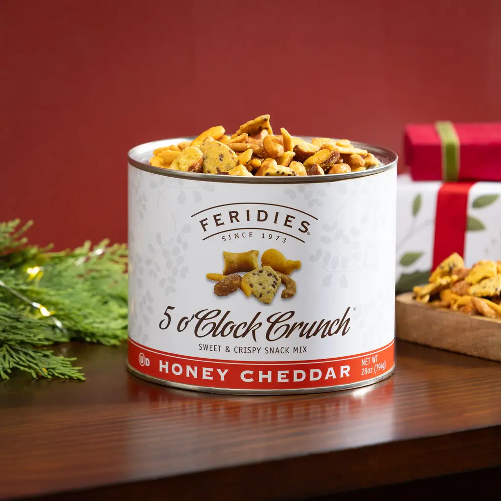 Snack time just got an upgrade with Feridies® 5 o'Clock Crunch Honey Cheddar Snack Mix! This irresistible 28 oz. tin is packed with the perfect sweet-and-savory balance of crunchy favorites—featuring honey-roasted sesame sticks, cheddar crackers, seasoned pretzels, corn sticks, and more. Each bite delivers bold cheddar flavor with a touch of honey sweetness for a taste that’s impossible to resist. Whether you're entertaining, road-tripping, or just looking for a satisfying afternoon pick-me-up, this gourmet snack mix is the ultimate go-to.